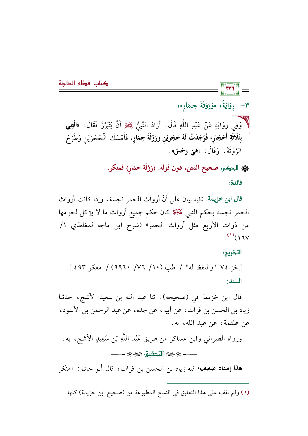قال ابن خزيمة: "فيه بيان على أَنَّ أرواث الحمر نجسة، وإذا كانت أرواث الحمر نجسة بحكم النبي عليه السلام كان حكم جميع أرواث ما لا يؤكل لحومها من ذوات الأربع مثل أرواث الحمر" (شرح ابن ماجه لمغلطاي ١/ ١٦٧) (¬١).