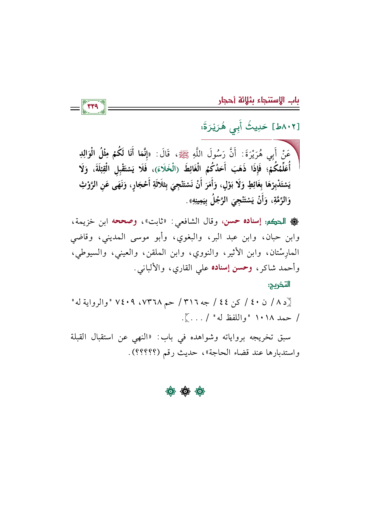 سبق تخريجه برواياته وشواهده في باب: "النهي عن استقبال القبلة واستدبارها عند قضاء الحاجة"، حديث رقم (؟ ؟ ؟ ؟ ؟ ).