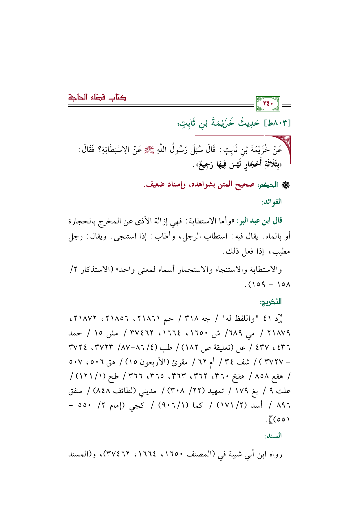 ◼ عَنْ خُزَيْمَةَ بْنِ ثَابِتٍ: قَالَ سُئِلَ رَسُولُ اللَّهِ صلى الله عليه وسلم عَنْ الِاسْتِطَابَةِ؟ فَقَالَ: «بِثَلَاثَةِ أَحْجَارٍ لَيْسَ فِيهَا رَجِيعٌ».