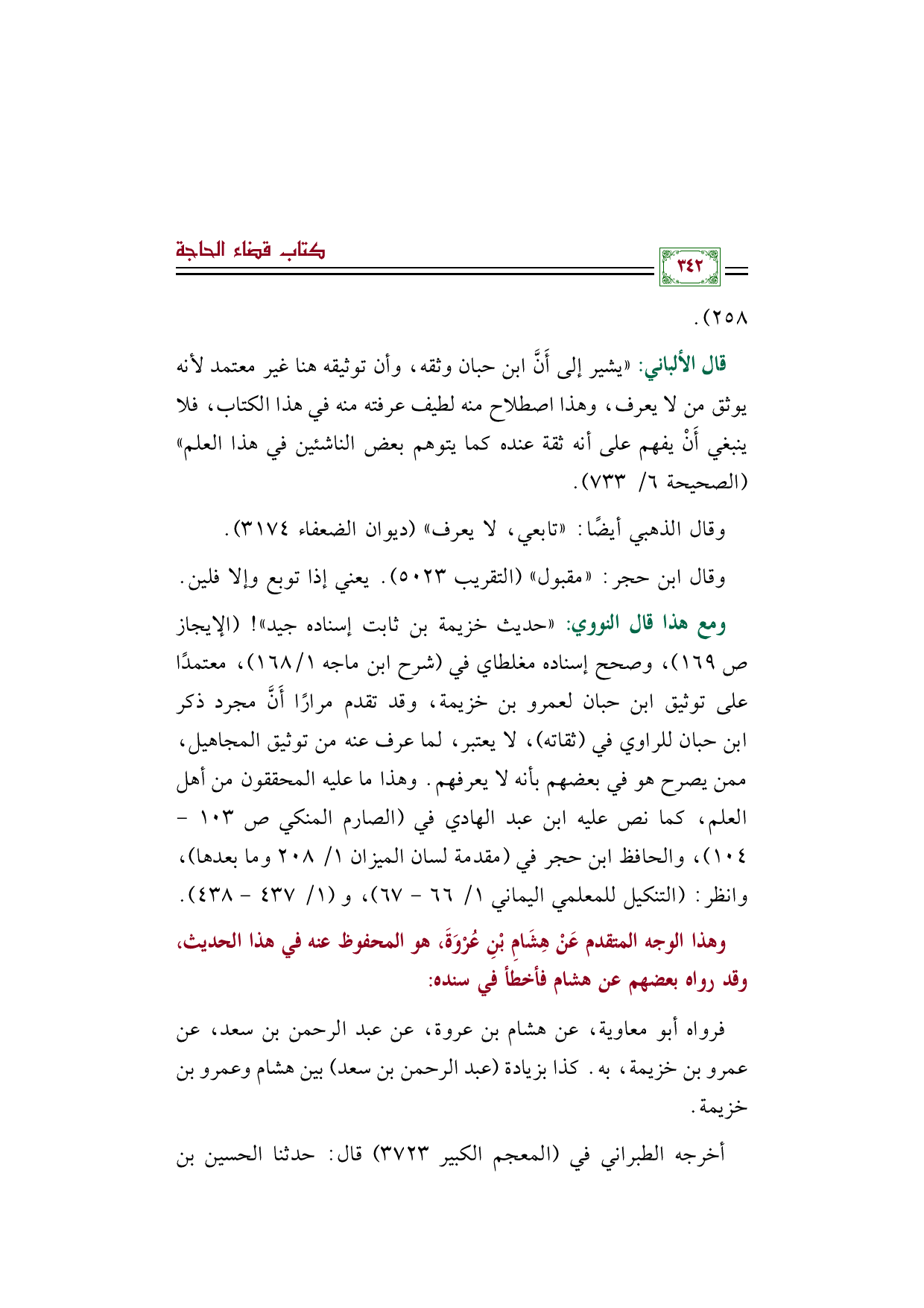 ومع هذا قال النووي: "حديث خزيمة بن ثابت إسناده جيد"! (الإيجاز ص ١٦٩)، وصحح إسناده مغلطاي في (شرح ابن ماجه ١/ ١٦٨)، معتمدًا على توثيق ابن حبان لعمرو بن خزيمة، وقد تقدم مرارًا أَنَّ مجرد ذكر ابن حبان للراوي في (ثقاته)، لا يعتبر، لما عرف عنه من توثيق المجاهيل، ممن يصرح هو في بعضهم بأنه لا يعرفهم. وهذا ما عليه المحققون من أهل العلم، كما نص عليه ابن عبد الهادي في (الصارم المنكي ص ١٠٣ - ١٠٤)، والحافظ ابن حجر في (مقدمة لسان الميزان ١/ ٢٠٨ وما بعدها)، وانظر: (التنكيل للمعلمي اليماني ١/ ٦٦ - ٦٧)، و (١/ ٤٣٧ - ٤٣٨).