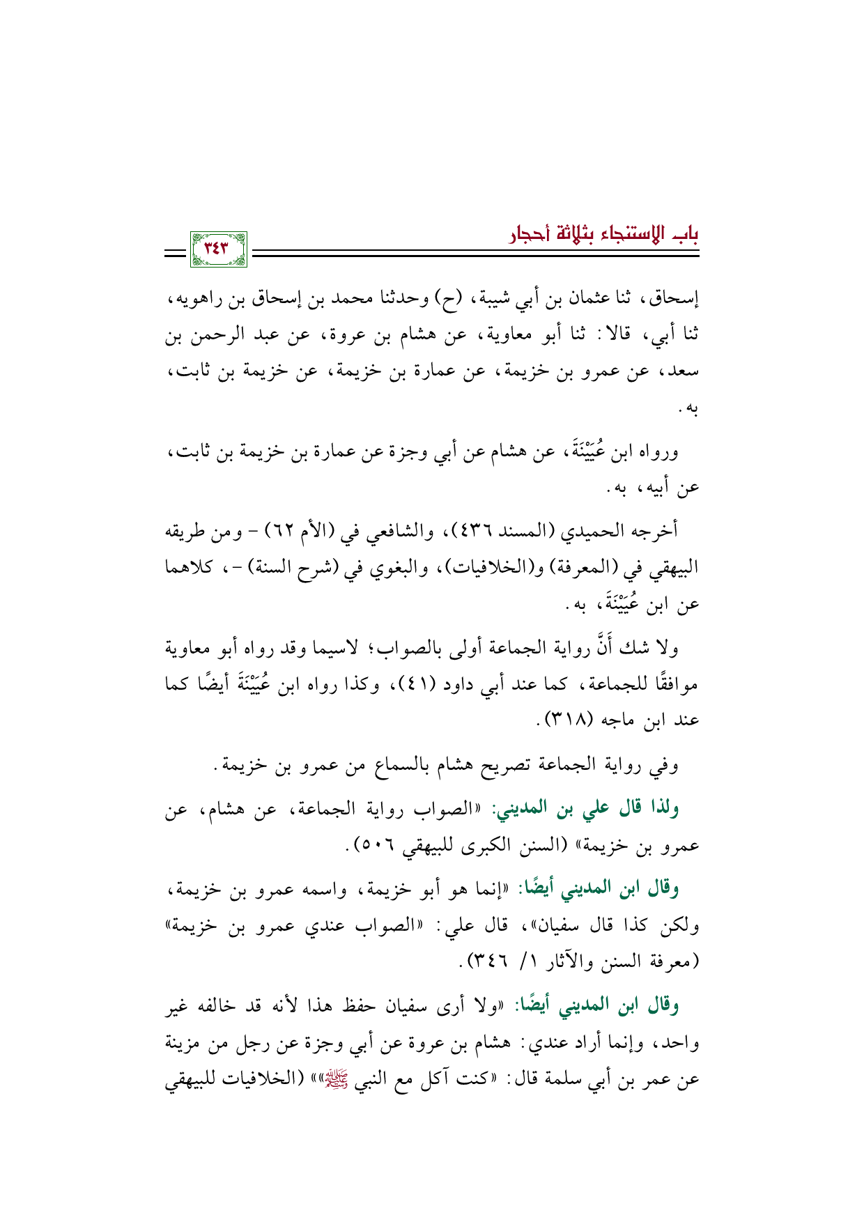 ولذا قال علي بن المديني: "الصواب رواية الجماعة، عن هشام، عن عمرو بن خزيمة" (السنن الكبرى للبيهقي ٥٠٦).