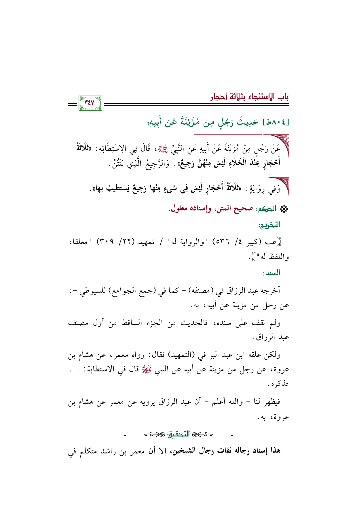 ولكن علقه ابن عبد البر في (التمهيد) فقال: رواه معمر، عن هشام بن عروة، عن رجل من مزينة عن أبيه عن النبي صلى الله عليه وسلم قال في الاستطابة: ... فذكره.