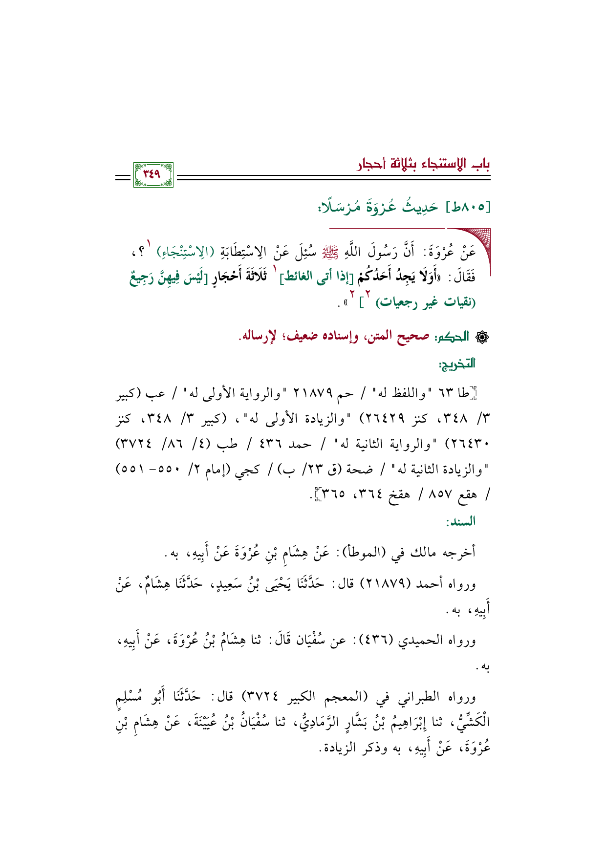 ◼ عَنْ عُرْوَةَ: أَنَّ رَسُولَ اللَّهِ صَلَّى اللهُ عَلَيْهِ وَسَلَّمَ سُئِلَ عَنْ الِاسْتِطَابَةِ (الِاسْتِنْجَاءِ) ١؟ ، فَقَالَ: «أَوَلَا يَجِدُ أَحَدُكُمْ [إذا أتى الغائط] ١ ثَلَاثَةَ أَحْجَارٍ [لَيْسَ فِيهِنَّ رَجِيعٌ (نقيات غير رجعيات) ٢] ٢».