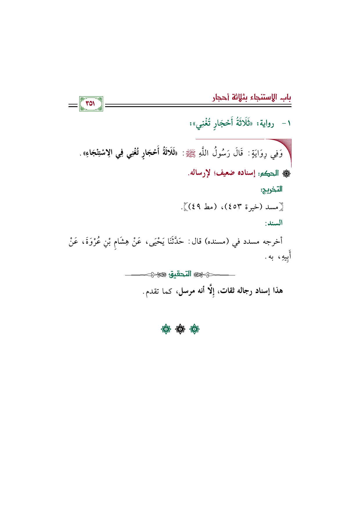 • وَفِي رِوَايَةٍ: قَالَ رَسُولُ اللَّهِ صَلَّى اللَّهُ عَلَيْهِ وَسَلَّمَ: «ثَلَاثَةُ أَحْجَارٍ تُغْنِي فِي الِاسْتِنْجَاءِ».