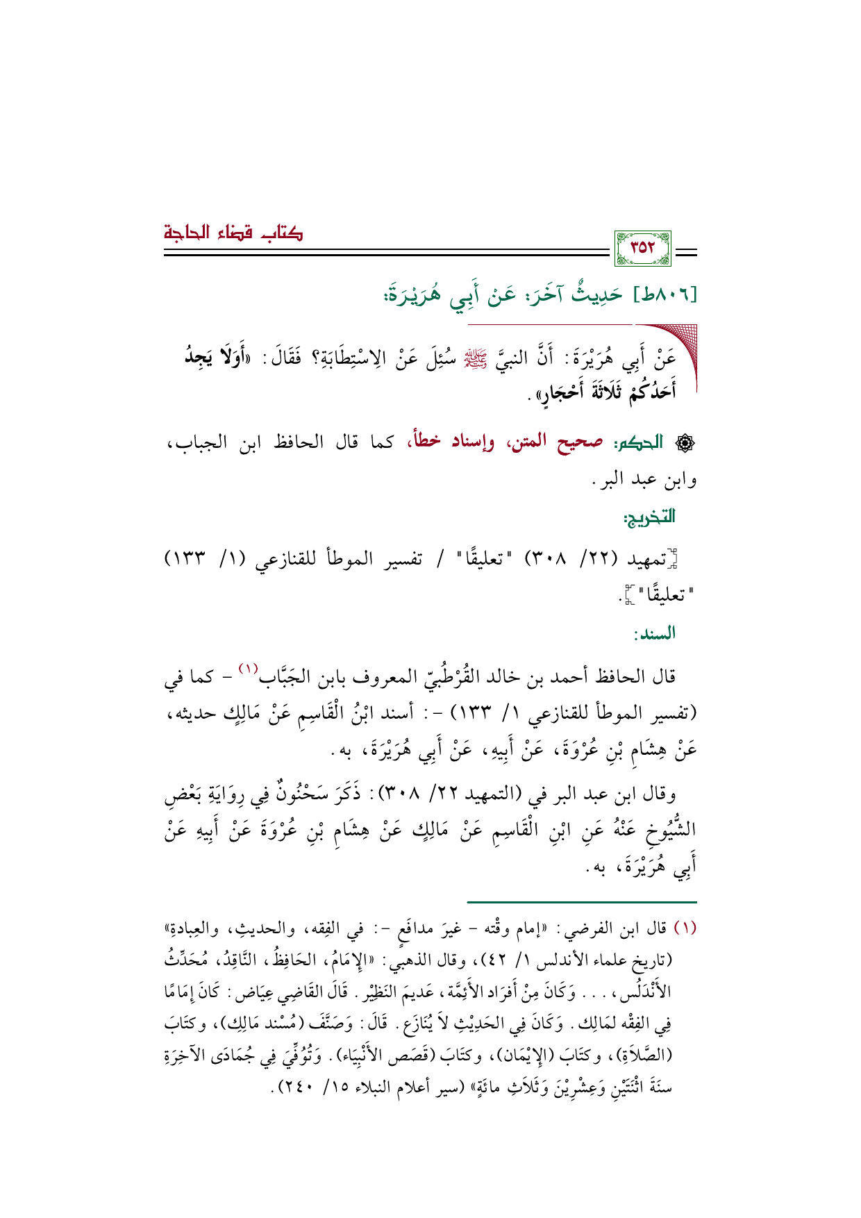 قال الحافظ أحمد بن خالد القُرْطُبيّ المعروف بابن الجَبَّاب (¬١) - كما في (تفسير الموطأ للقنازعي ١/ ١٣٣) -: أسند ابْنُ الْقَاسِمِ عَنْ مَالِكٍ حديثه، عَنْ هِشَامِ بْنِ عُرْوَةَ، عَنْ أَبِيهِ، عَنْ أَبِي هُرَيْرَةَ، به.