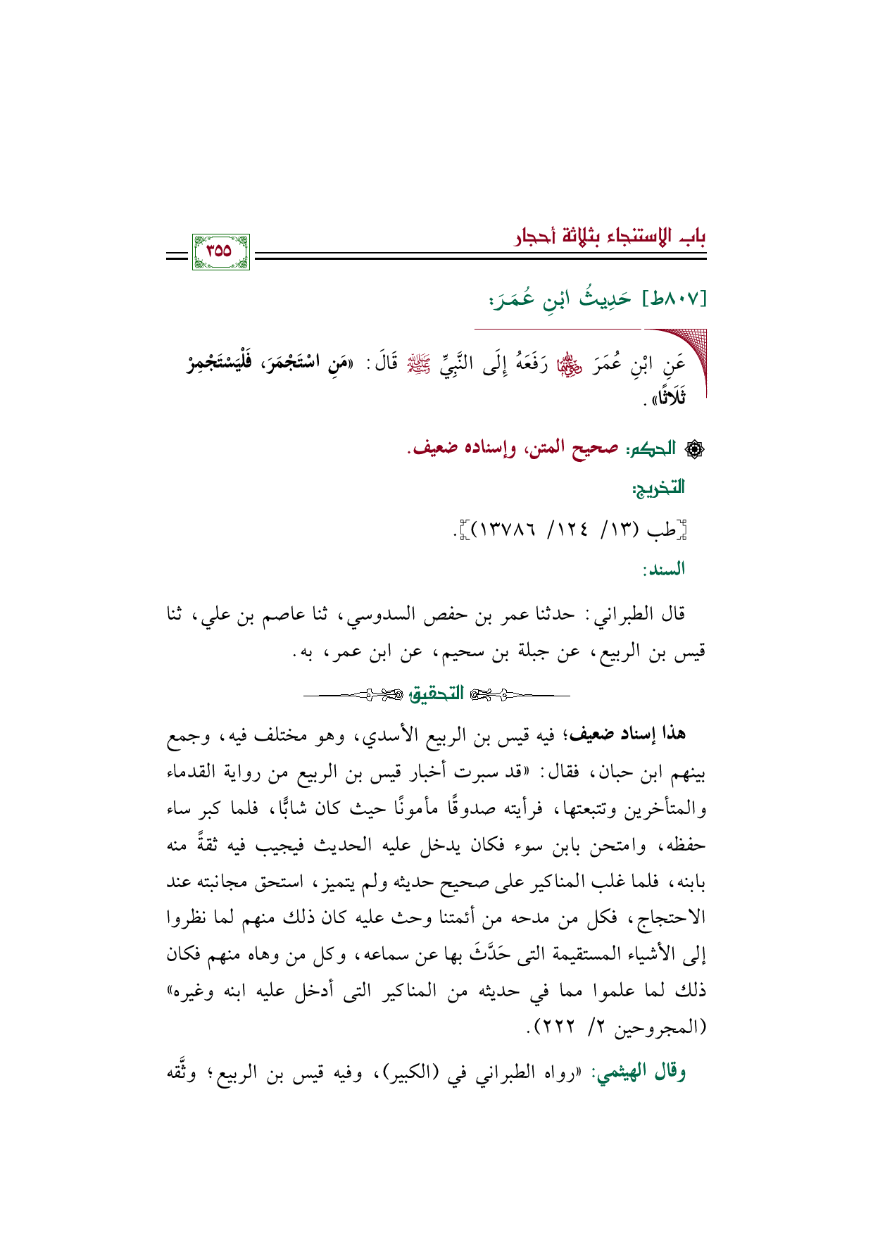 وقال الهيثمي: "رواه الطبراني في (الكبير)، وفيه قيس بن الربيع؛ وثَّقه