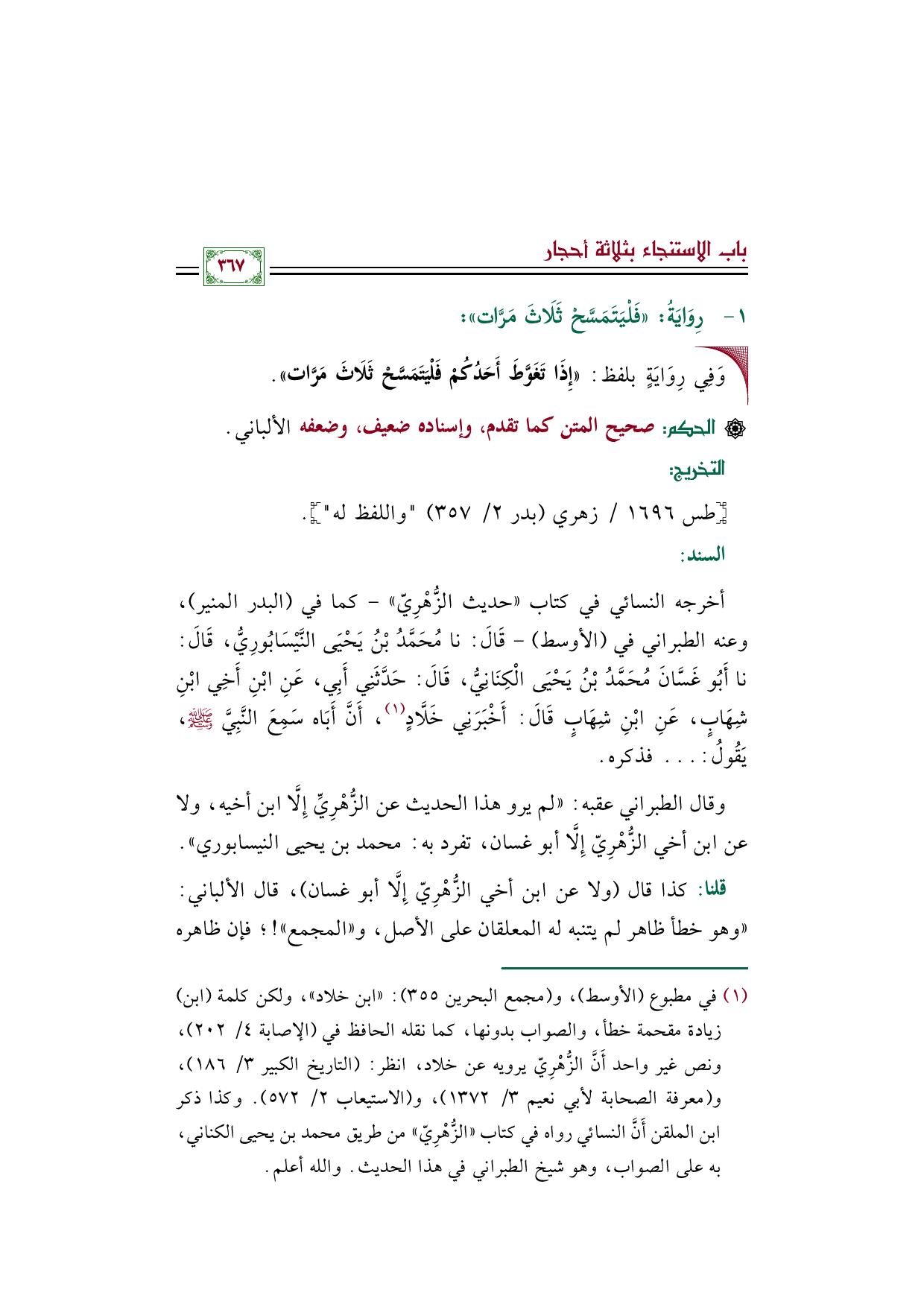 قلنا: كذا قال (ولا عن ابن أخي الزُّهْرِيّ إِلَّا أبو غسان)، قال الألباني: "وهو خطأ ظاهر لم يتنبه له المعلقان على الأصل، و"المجمع"!؛ فإن ظاهره