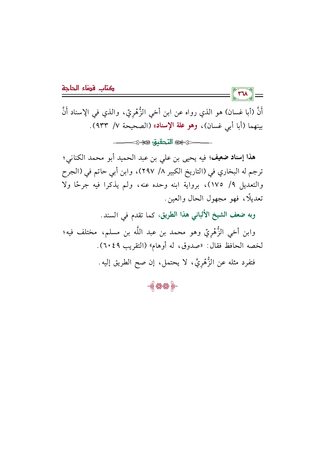 أَنَّ (أبا غسان) هو الذي رواه عن ابن أخي الزُّهْرِيّ، والذي في الإسناد أَنَّ بينهما (أبا أبي غسان)، وهو علة الإسناد" (الصحيحة ٧/ ٩٣٣).