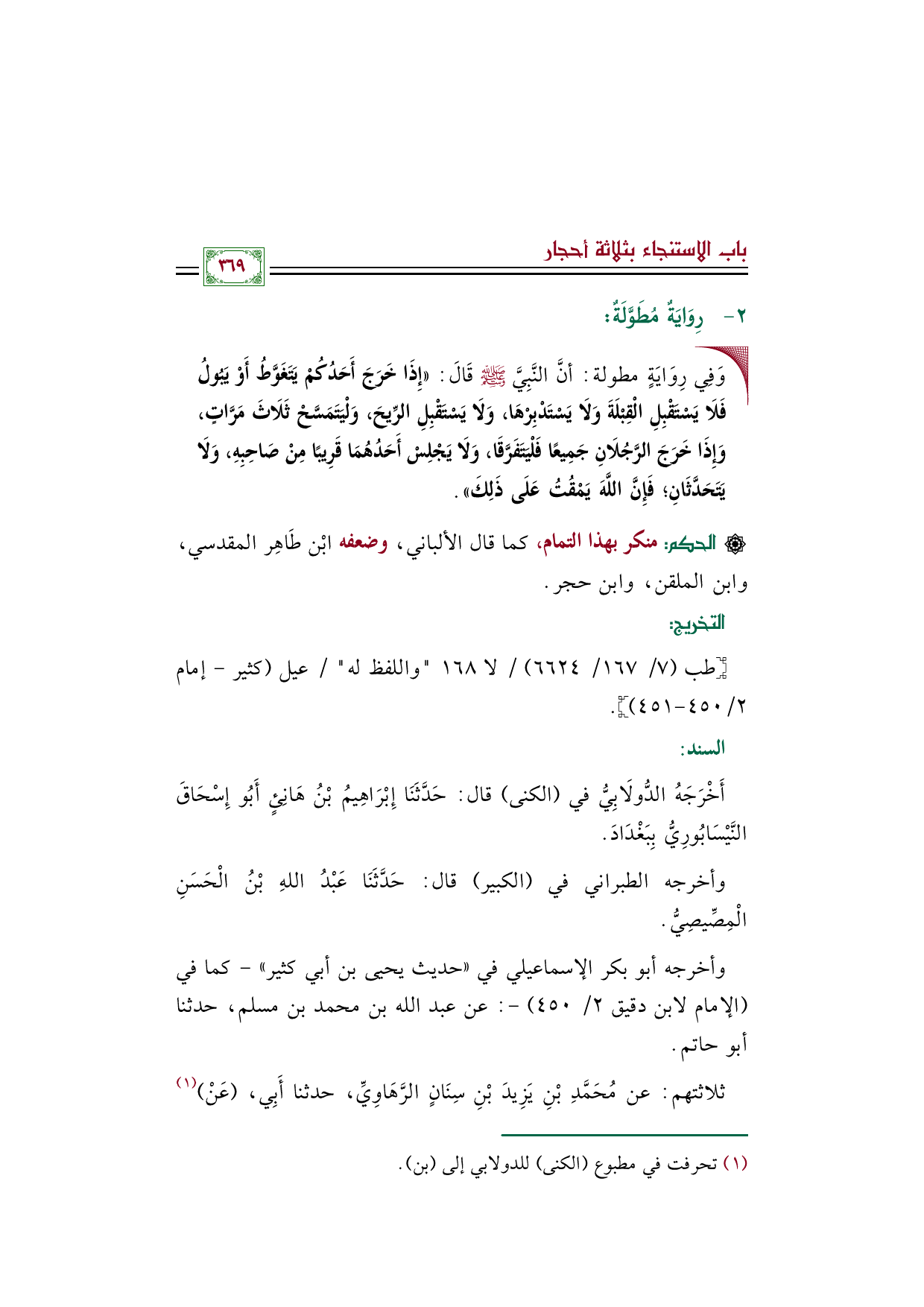 أَخْرَجَهُ الدُّولَابِيُّ في (الكنى) قال: حَدَّثَنَا إِبْرَاهِيمُ بْنُ هَانِئٍ أَبُو إِسْحَاقَ النَّيْسَابُورِيُّ بِبَغْدَادَ.