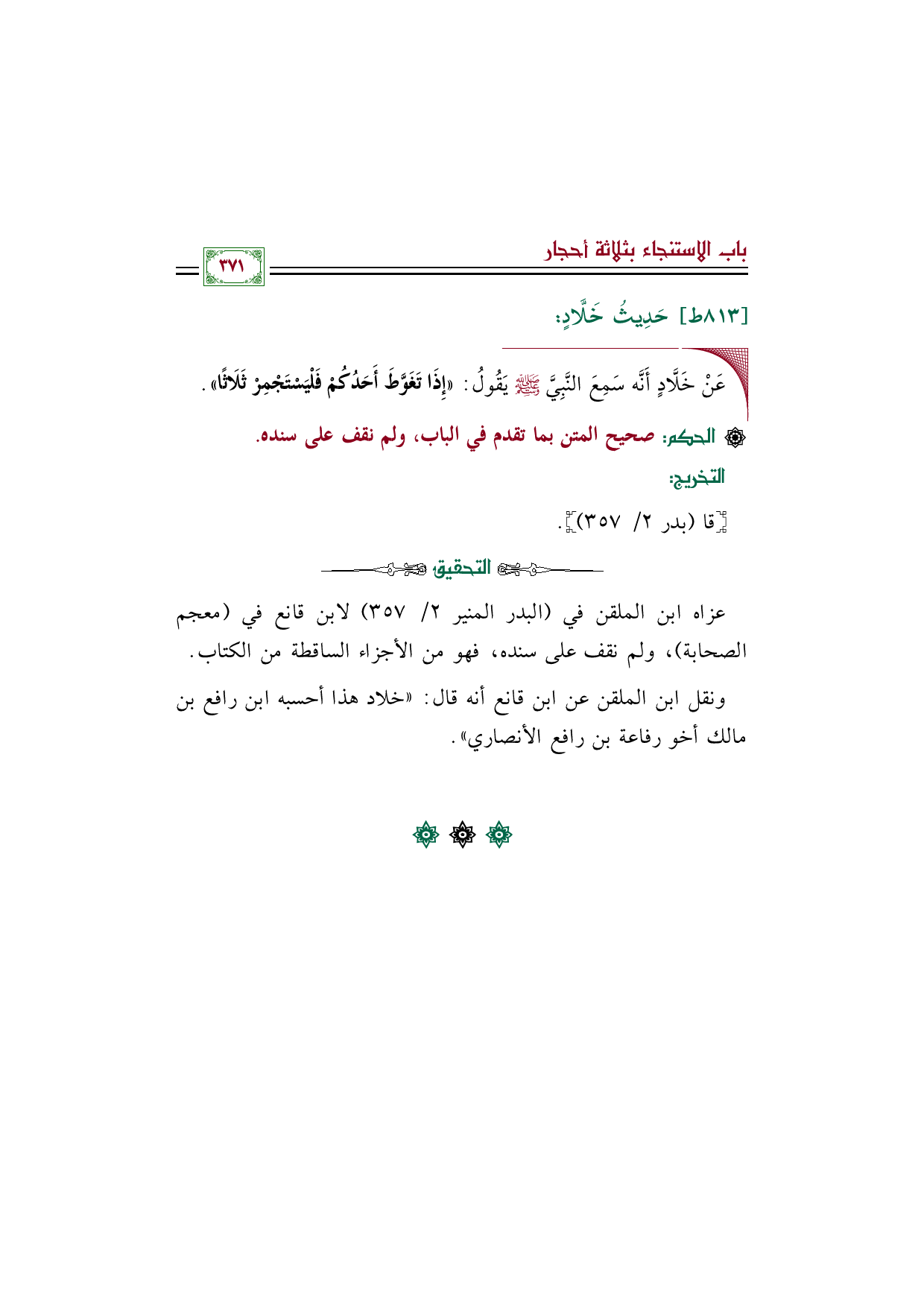 ونقل ابن الملقن عن ابن قانع أنه قال: "خلاد هذا أحسبه ابن رافع بن مالك أخو رفاعة بن رافع الأنصاري".