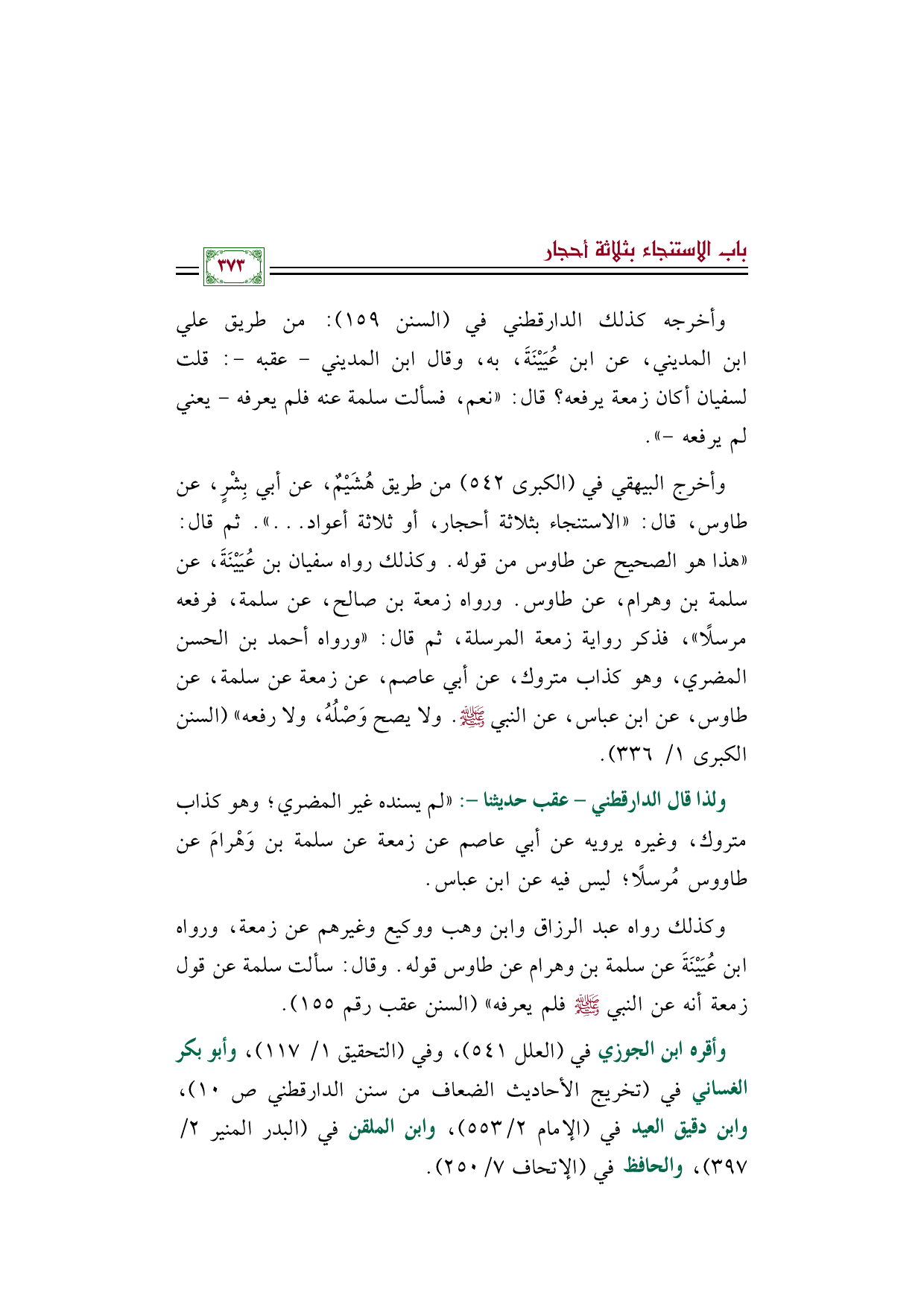 وأخرج البيهقي في (الكبرى ٥٤٢) من طريق هُشَيْمٌ، عن أبي بِشْرٍ، عن طاوس، قال: «الاستنجاء بثلاثة أحجار، أو ثلاثة أعواد ... ». ثم قال: "هذا هو الصحيح عن طاوس من قوله. وكذلك رواه سفيان بن عُيَيْنَةَ، عن سلمة بن وهرام، عن طاوس. ورواه زمعة بن صالح، عن سلمة، فرفعه مرسلًا"، فذكر رواية زمعة المرسلة، ثم قال: "ورواه أحمد بن الحسن المضري، وهو كذاب متروك، عن أبي عاصم، عن زمعة عن سلمة، عن طاوس، عن ابن عباس، عن النبي صلى الله عليه وسلم. ولا يصح وَصْلُهُ، ولا رفعه" (السنن الكبرى ١/ ٣٣٦).