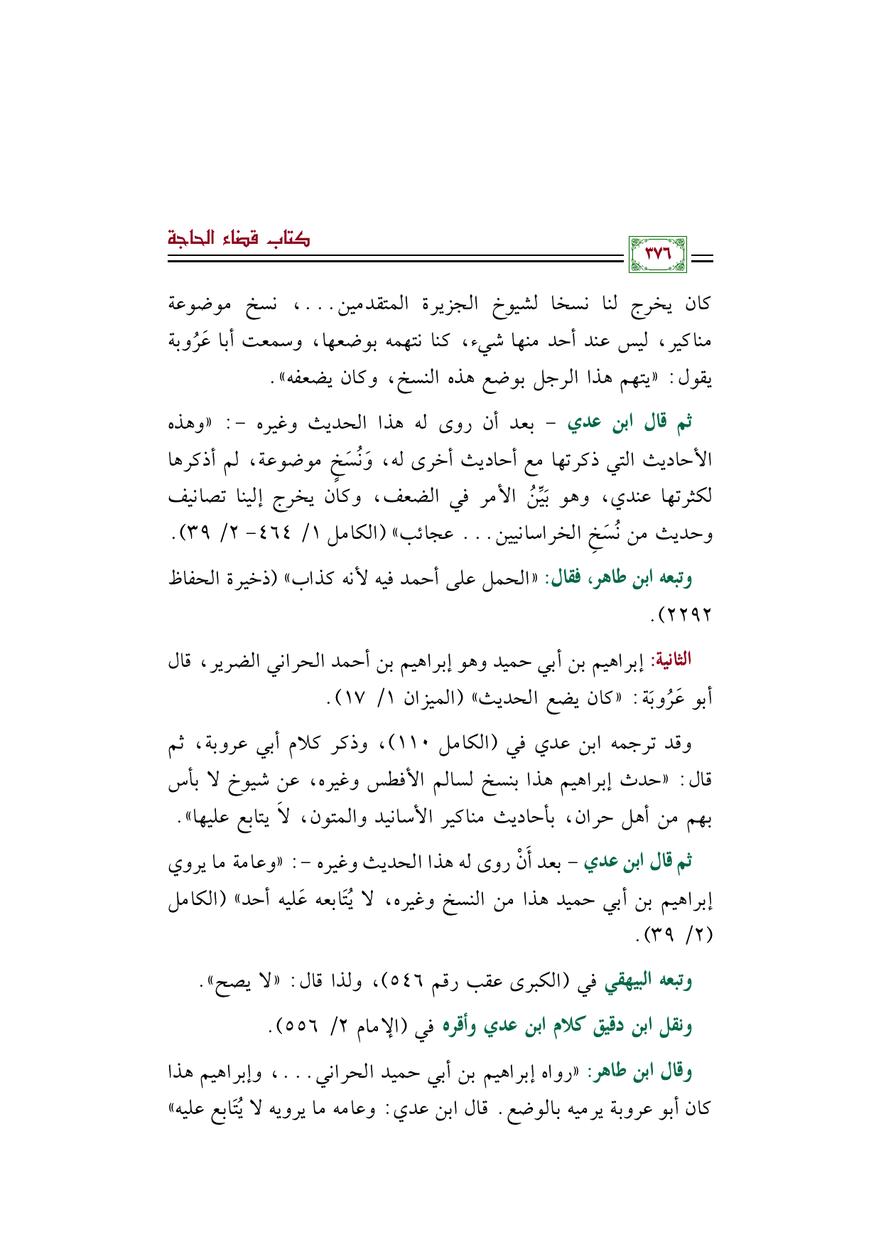 وقد ترجمه ابن عدي في (الكامل ١١٠)، وذكر كلام أبي عروبة، ثم قال: "حدث إبراهيم هذا بنسخ لسالم الأفطس وغيره، عن شيوخ لا بأس بهم من أهل حران، بأحاديث مناكير الأسانيد والمتون، لا يتابع عليها".