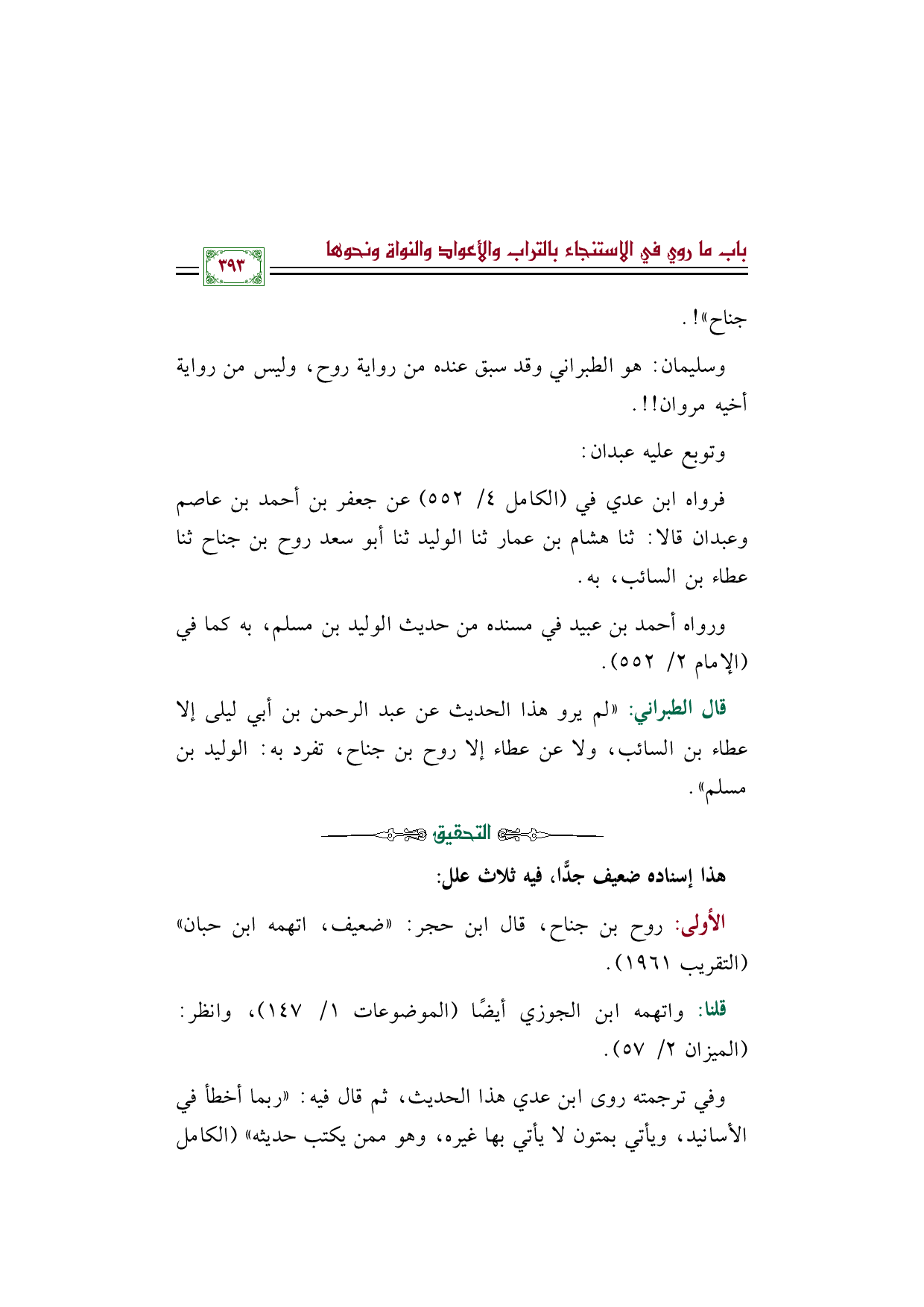 قال الطبراني: "لم يرو هذا الحديث عن عبد الرحمن بن أبي ليلى إلا عطاء بن السائب، ولا عن عطاء إلا روح بن جناح، تفرد به: الوليد بن مسلم".