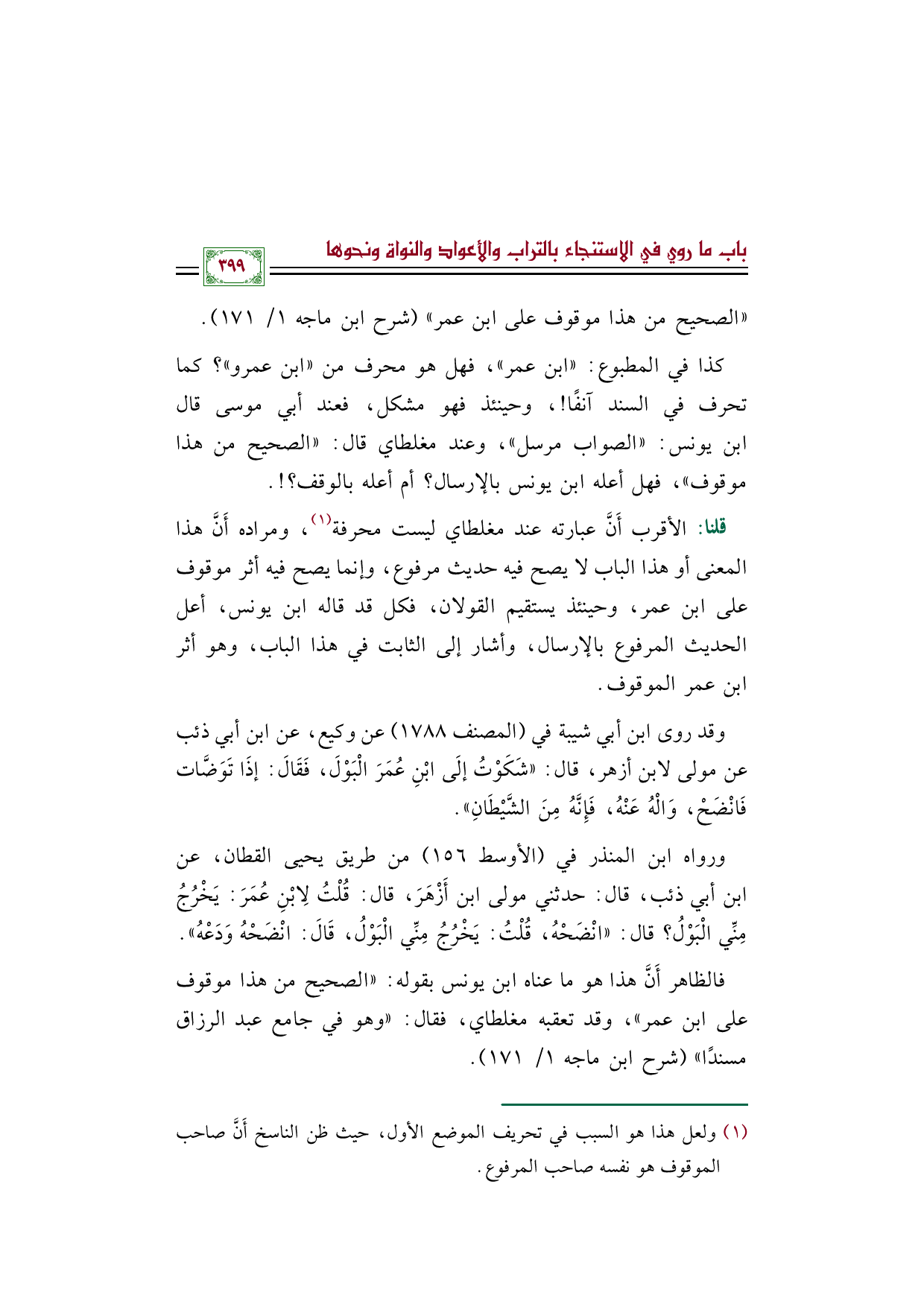 فالظاهر أَنَّ هذا هو ما عناه ابن يونس بقوله: "الصحيح من هذا موقوف على ابن عمر"، وقد تعقبه مغلطاي، فقال: "وهو في جامع عبد الرزاق مسندًا" (شرح ابن ماجه ١/ ١٧١).