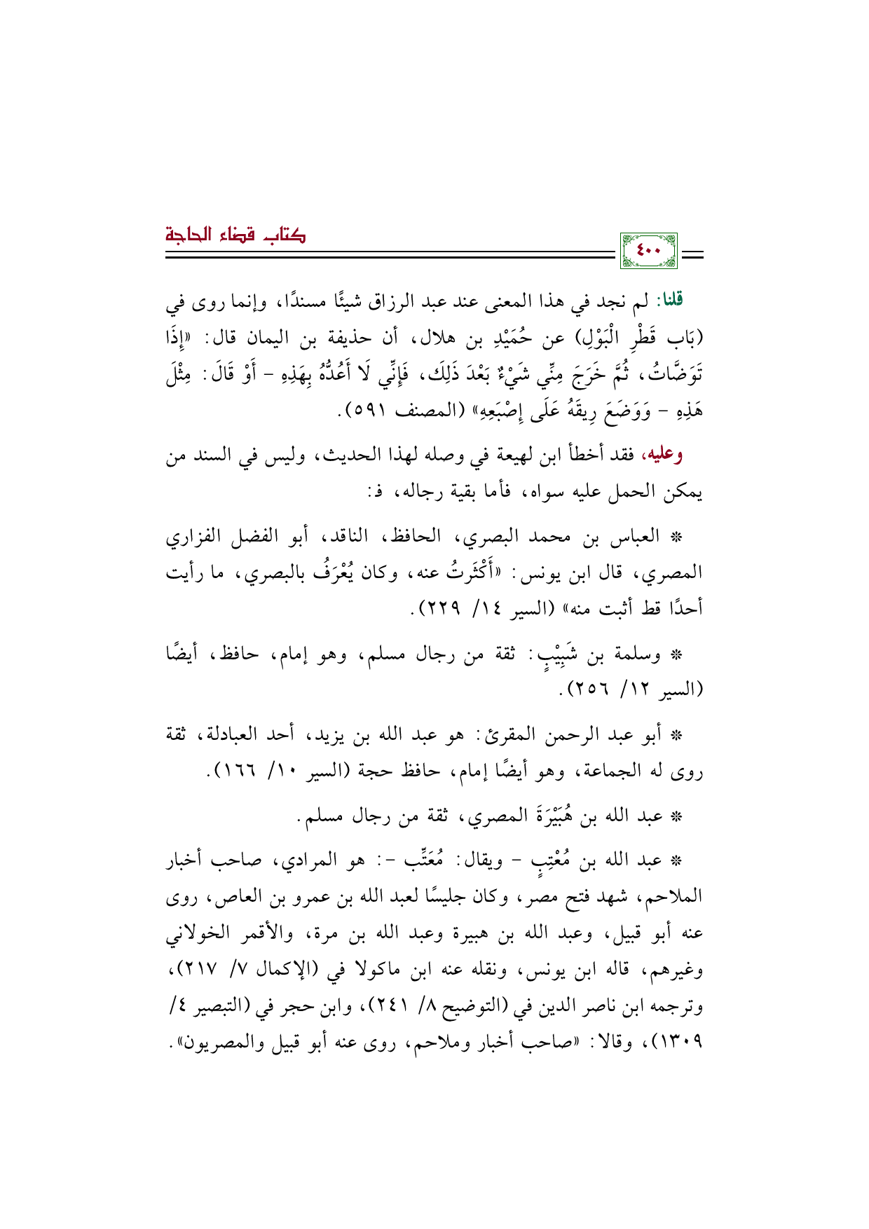 قلنا: لم نجد في هذا المعنى عند عبدالرزاق شيئًا مسندًا، وإنما روى في (بَاب قَطْرِ الْبَوْلِ) عن حُمَيْدِ بن هلال، أن حذيفة بن اليمان قال: "إِذَا تَوَضَّاتُ، ثُمَّ خَرَجَ مِنِّي شَيْءٌ بَعْدَ ذَلِكَ، فَإِنِّي لَا أَعُدُّهُ بِهَذِهِ - أَوْ قَالَ: مِثْلَ هَذِهِ - وَوَضَعَ رِيقَهُ عَلَى إِصْبَعِهِ" (المصنف ٥٩١).
