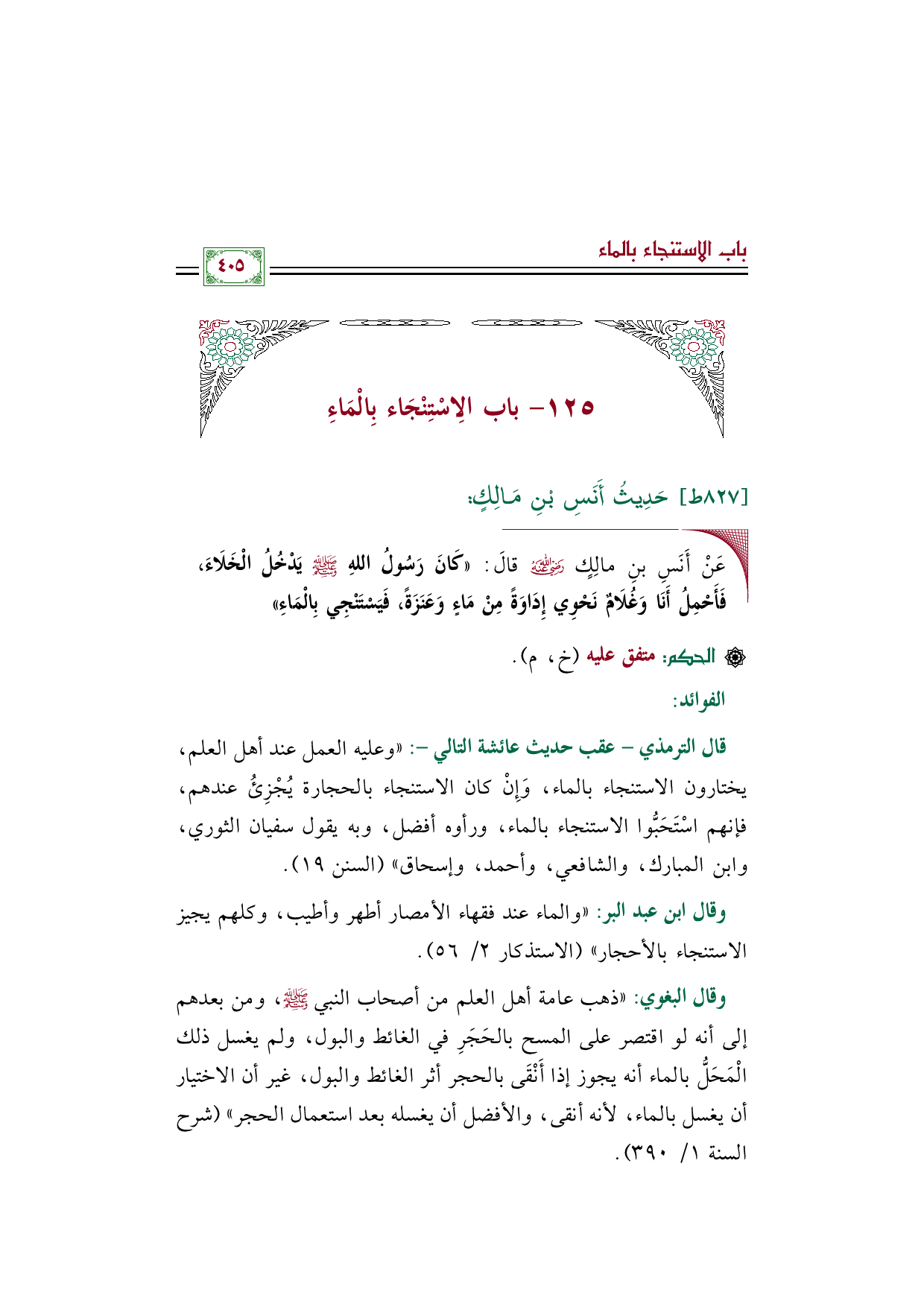 قال الترمذي - عقب حديث عائشة التالي -: "وعليه العمل عند أهل العلم، يختارون الاستنجاء بالماء، وَإِنْ كان الاستنجاء بالحجارة يُجْزِئُ عندهم، فإنهم اسْتَحَبُّوا الاستنجاء بالماء، ورأوه أفضل، وبه يقول سفيان الثوري، وابن المبارك، والشافعي، وأحمد، وإسحاق" (السنن ١٩).