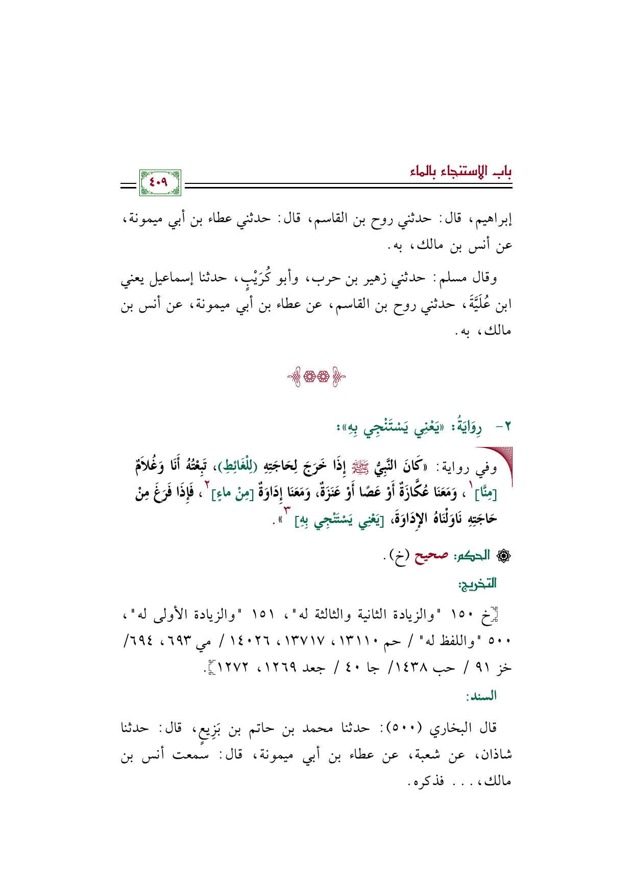 •وفي رواية: «كَانَ النَّبِيُّ صَلَّى اللهُ عَلَيْهِ وَسَلَّمَ إِذَا خَرَجَ لِحَاجَتِهِ (لِلْغَائِطِ)، تَبِعْتُهُ أَنَا وَغُلامٌ [مِنَّا] ١، وَمَعَنَا عُكَّازَةٌ أَوْ عَصًا أَوْ عَنَزَةٌ، وَمَعَنَا إِدَاوَةٌ [مِنْ ماءٍ] ٢، فَإِذَا فَرَغَ مِنْ حَاجَتِهِ نَاوَلْنَاهُ الإِدَاوَةَ، [يَعْنِي يَسْتَنْجِي بِهِ] ٣».