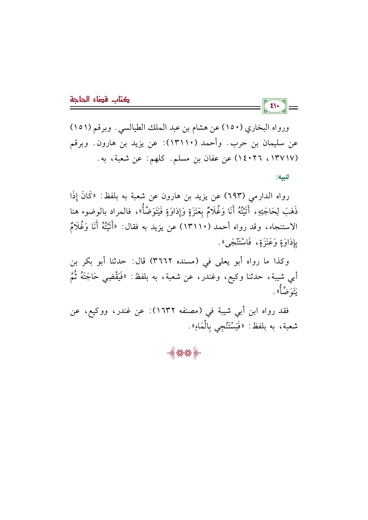 رواه الدارمي (٦٩٣) عن يزيد بن هارون عن شعبة به بلفظ: «كَانَ إِذَا ذَهَبَ لِحَاجَتِهِ، أَتَيْتُهُ أَنَا وَغُلَامٌ بِعَنَزَةٍ وَإِدَاوَةٍ فَيَتَوَضَّأُ»، فالمراد بالوضوء هنا الاستنجاء، وقد رواه أحمد (١٣١١٠) عن يزيد به فقال: «أَتَيْتُهُ أَنَا وَغُلَامٌ بِإِدَاوَةٍ وَعَنَزَةٍ، فَاسْتَنْجَى».
