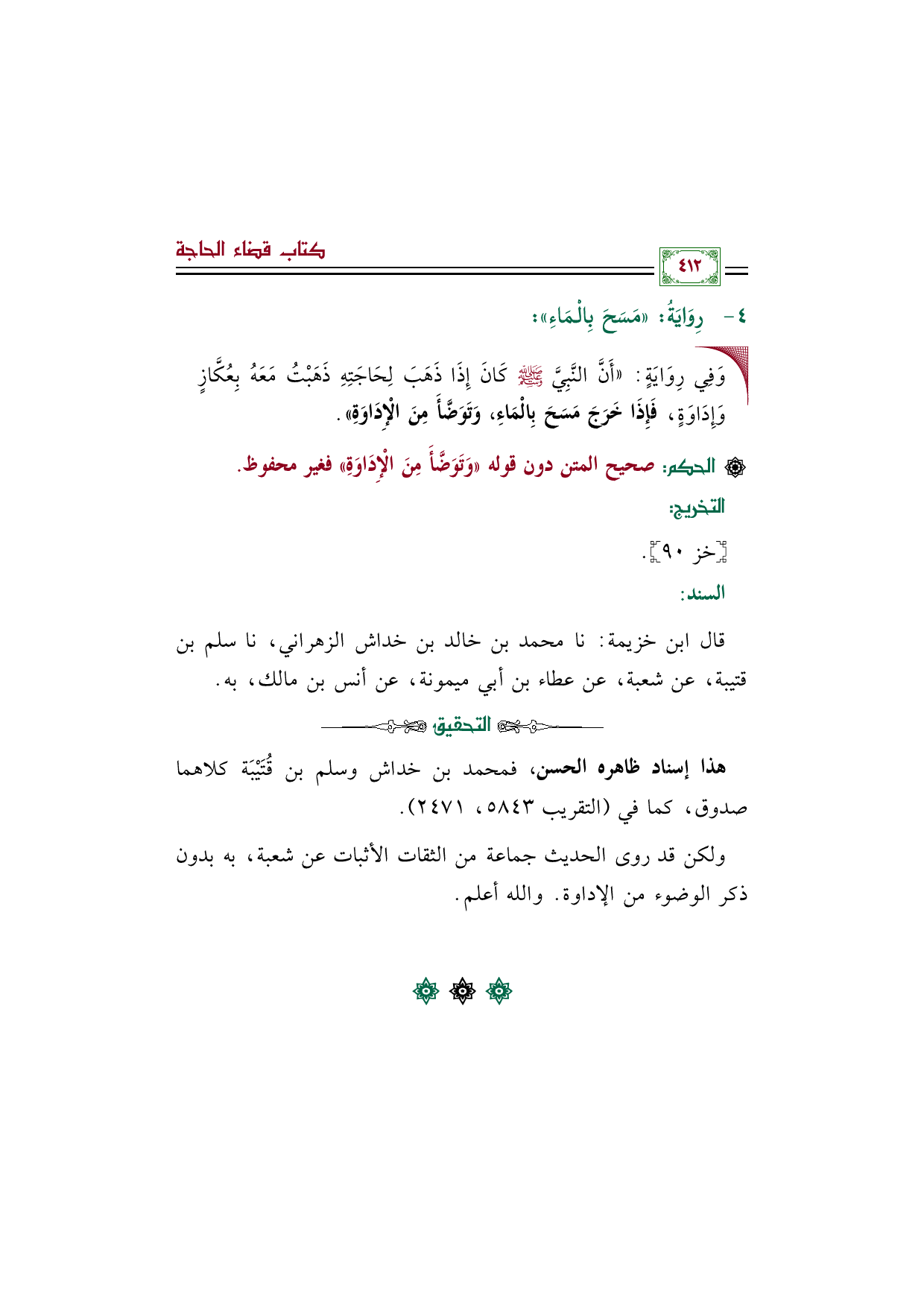 ولكن قد روى الحديث جماعة من الثقات الأثبات عن شعبة، به بدون ذكر الوضوء من الإداوة. والله أعلم.