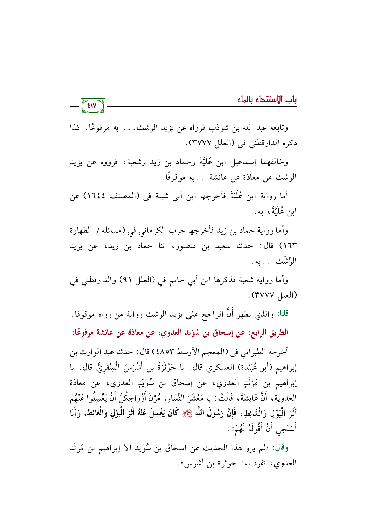 أخرجه الطبراني في (المعجم الأوسط ٤٨٥٣) قال: حدثنا عبد الوارث بن إبراهيم (أبو عُبَيْدة) العسكري قال: نا حَوْثَرَةُ بن أَشْرَسَ الْمِنْقَرِيُّ قال: نا إبراهيم بن مَرْثَدٍ العدوي، عن إسحاق بن سُوَيْدٍ العدوي، عن معاذة العدوية، أَنَّ عَائِشَةَ، قَالَتْ: يَا مَعْشَرَ النِّسَاءِ، مُرْنَ أَزْوَاجَكُنَّ أَنْ يَغْسِلُوا عَنْهُمْ أَثَرَ الْبَوْلِ وَالْغَائِطِ، فَإِنَّ رَسُولَ اللَّهِ صَلَّى اللهُ عَلَيْهِ وَسَلَّمَ كَانَ يَغْسِلُ عَنْهُ أَثَرَ الْبَوْلِ وَالْغَائِطِ، وَأَنَا أَسْتَحِي أَنْ أَقُولَهُ لَهُمْ».