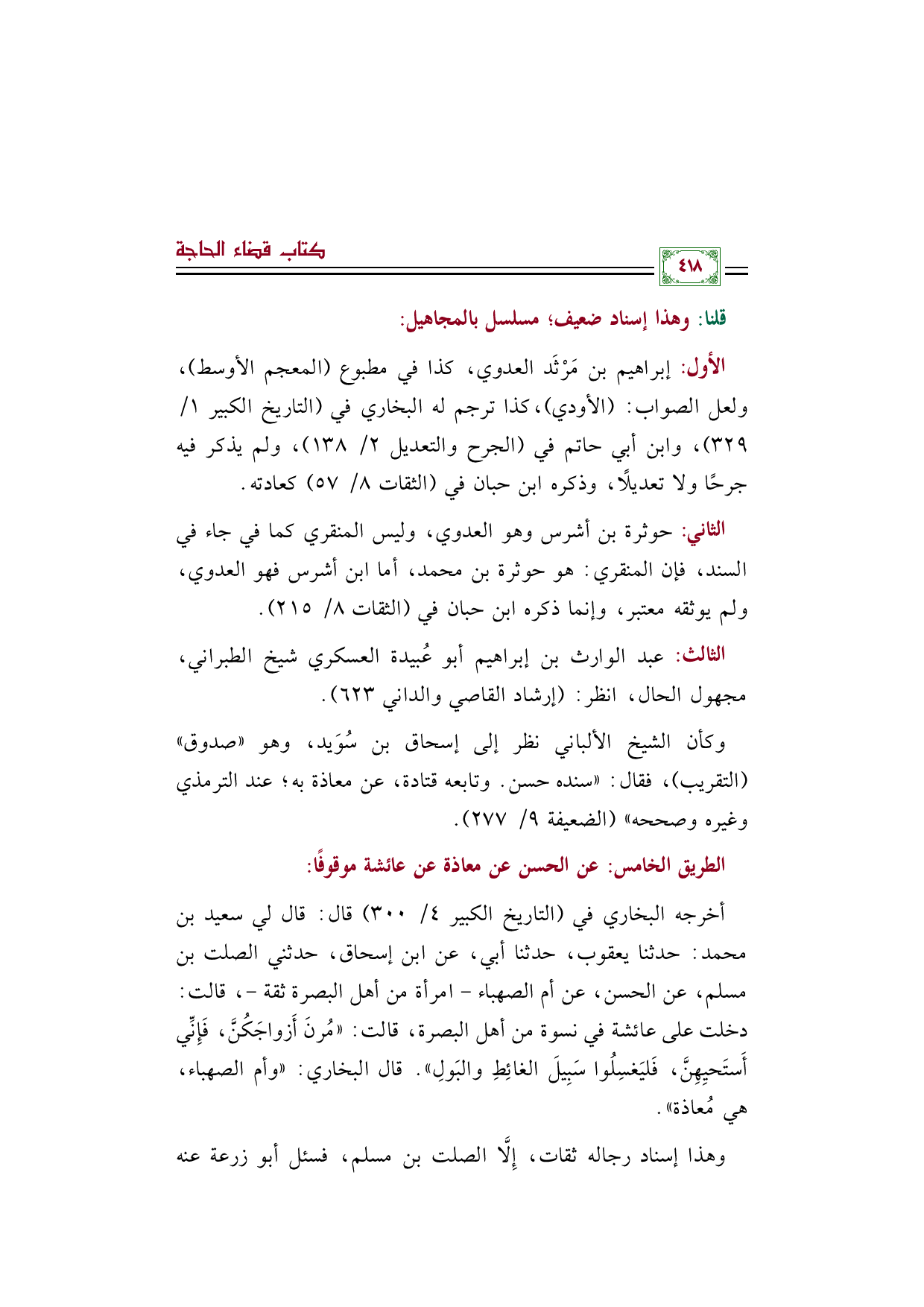 أخرجه البخاري في (التاريخ الكبير ٤/ ٣٠٠) قال: قال لي سعيد بن محمد: حدثنا يعقوب، حدثنا أبي، عن ابن إسحاق، حدثني الصلت بن مسلم، عن الحسن، عن أم الصهباء - امرأة من أهل البصرة ثقة -، قالت: دخلت على عائشة في نسوة من أهل البصرة، قالت: «مُرنَ أَزواجَكُنَّ، فَإِنِّي أَستَحيِهِنَّ، فَليَغسِلُوا سَبِيلَ الغائِطِ والبَولِ». قال البخاري: "وأم الصهباء، هي مُعاذة".