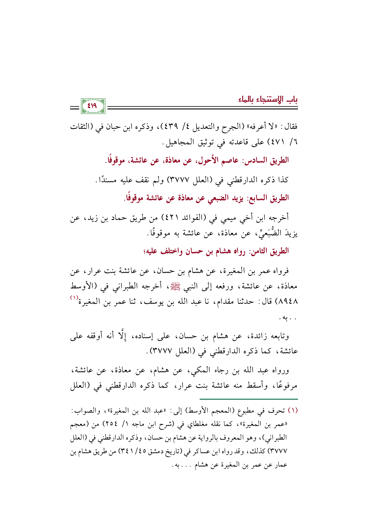 (¬١) تحرف في مطبوع "المعجم الأوسط" إلى: "عبد الله بن المغيرة"، والصواب: "عمر بن المغيرة"، كما نقله مغلطاي في (شرح ابن ماجه ١/ ٢٥٤) من معجم الطبراني، وهو المعروف بالرواية عن هشام بن حسان، وذكره الدارقطني في (العلل ٣٧٧٧) كذلك، وقد رواه ابن عساكر في (تاريخ دمشق ٤٥/ ٣٤١) من طريق هشام بن عمار عن عمر بن المغيرة عن هشام ... به.
