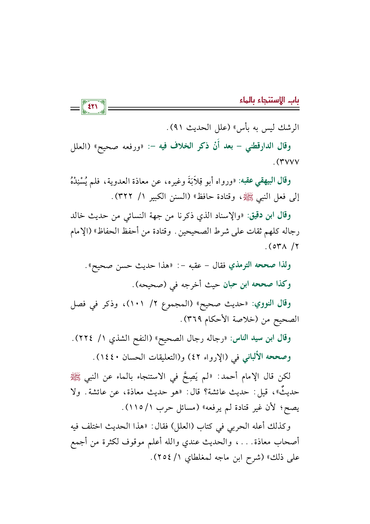 لكن قال الإمام أحمد: "لم يَصِحَّ في الاستنجاء بالماء عن النبي صلى الله عليه وسلم حديثٌ»، قيل: حديث عائشة؟ قال: "هو حديث معاذة، عن عائشة. ولا يصح؛ لأن غير قتادة لم يرفعه" (مسائل حرب ١/ ١١٥).