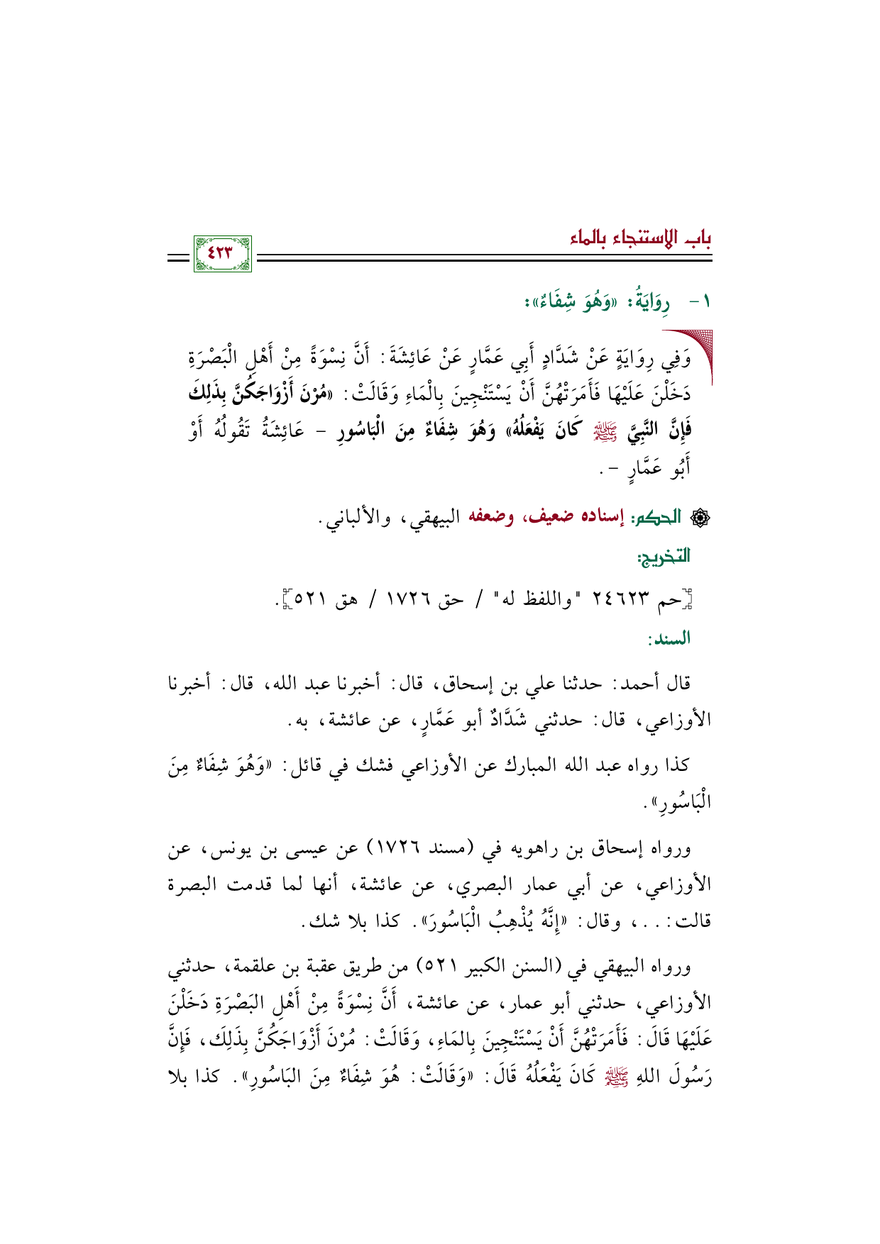 ورواه البيهقي في (السنن الكبير ٥٢١) من طريق عقبة بن علقمة، حدثني الأوزاعي، حدثني أبو عمار، عن عائشة، أَنَّ نِسْوَةً مِنْ أَهْلِ البَصْرَةِ دَخَلْنَ عَلَيْهَا قَالَ: فَأَمَرَتْهُنَّ أَنْ يَسْتَنْجِينَ بِالمَاءِ، وَقَالَتْ: مُرْنَ أَزْوَاجَكُنَّ بِذَلِكَ، فَإِنَّ رَسُولَ اللهِ صَلى الله عَلَيهِ وَسَلمَ كَانَ يَفْعَلُهُ قَالَ: «وَقَالَتْ: هُوَ شِفَاءٌ مِنَ البَاسُورِ». كذا بلا