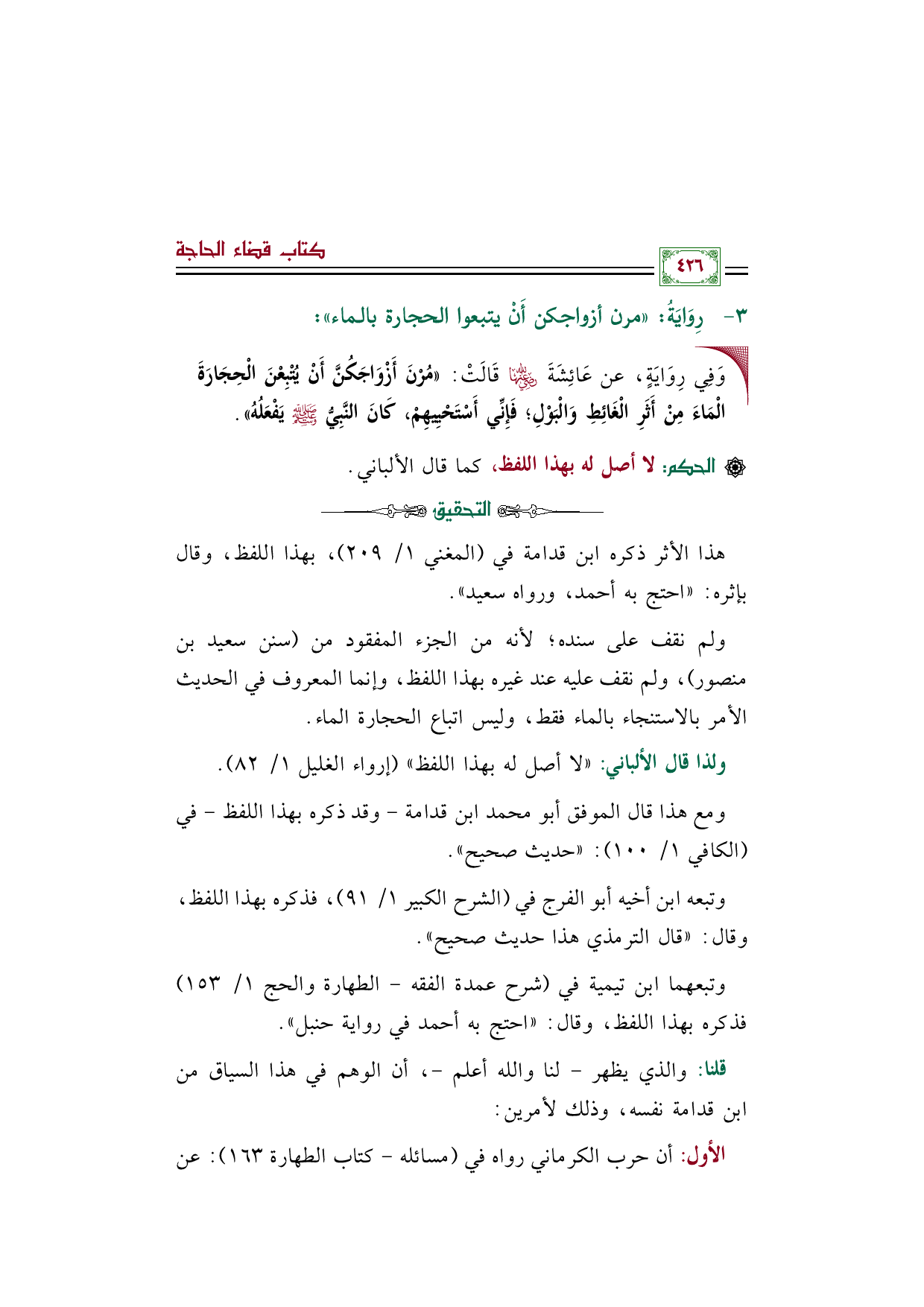 ومع هذا قال الموفق أبو محمد ابن قدامة - وقد ذكره بهذا اللفظ - في (الكافي ١/ ١٠٠): "حديث صحيح".