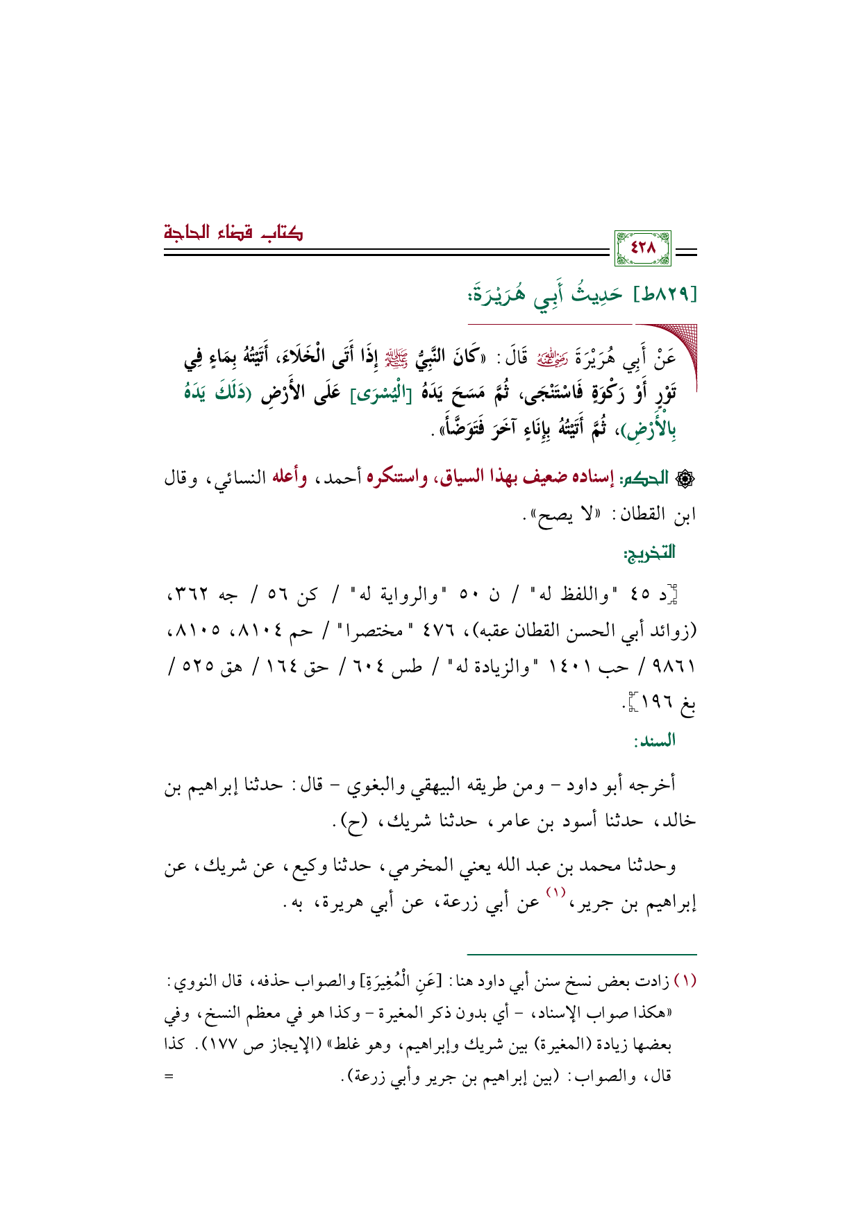 (¬١) زادت بعض نسخ سنن أبي داود هنا: [عَنِ الْمُغِيرَةِ] والصواب حذفه، قال النووي: "هكذا صواب الإسناد، - أي بدون ذكر المغيرة - وكذا هو في معظم النسخ، وفي بعضها زيادة (المغيرة) بين شريك وإبراهيم، وهو غلط" (الإيجاز ص ١٧٧). كذا قال، والصواب: (بين إبراهيم بن جرير وأبي زرعة).