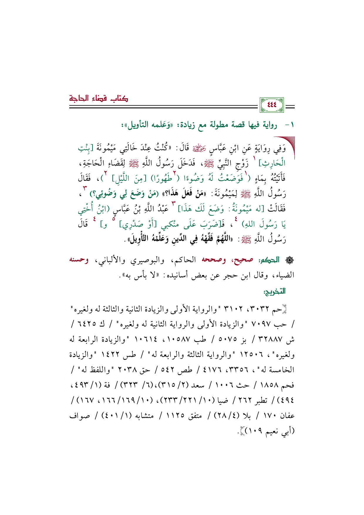 • وَفِي رِوَايَةٍ عَنِ ابْنِ عَبَّاسٍ رضي الله عنه قَالَ: «كُنْتُ عِنْدَ خَالَتِي مَيْمُونَةَ [بِنْتِ الْحَارِثِ] ١ زَوْجِ النَّبِيِّ صَلَّى اللهُ عَلَيْهِ وَسَلَّمَ، فَدَخَلَ رَسُولُ اللَّهِ صَلَّى اللهُ عَلَيْهِ وَسَلَّمَ لِقَضَاءِ الْحَاجَةِ، فَأَتَيْتُهُ بِمَاءٍ (١ فَوَضَعْتُ لَهُ وَضُوءًا (٢ طَهُورًا) [مِنَ اللَّيْلِ] ٢)، فَقَالَ رَسُولُ اللَّهِ -صَلَّى اللهُ عَلَيْهِ وَسَلَّمَ- لِمَيْمُونَةَ: «مَنْ فَعَلَ هَذَا؟» (مَنْ وَضَعَ لِي وَضُوئِي؟) ٣، فَقَالَتْ [له مَيْمُونَةُ: وَضَعَ لَكَ هَذَا] ٣ عَبْدُ اللَّهِ بْنُ عَبَّاسٍ (ابْنُ أُخْتِي يَا رَسُولَ اللهِ) ٤، فَـ[ضَرَبَ عَلَى منْكبي [أَوْ صَدْرِي] ٥ و] ٤ قَالَ رَسُولُ اللَّهِ صَلَّى اللهُ عَلَيْهِ وَسَلَّمَ: «اللَّهُمَّ فَقِّهْهُ فِي الدِّينِ وَعَلِّمْهُ التَّأْوِيلَ».
