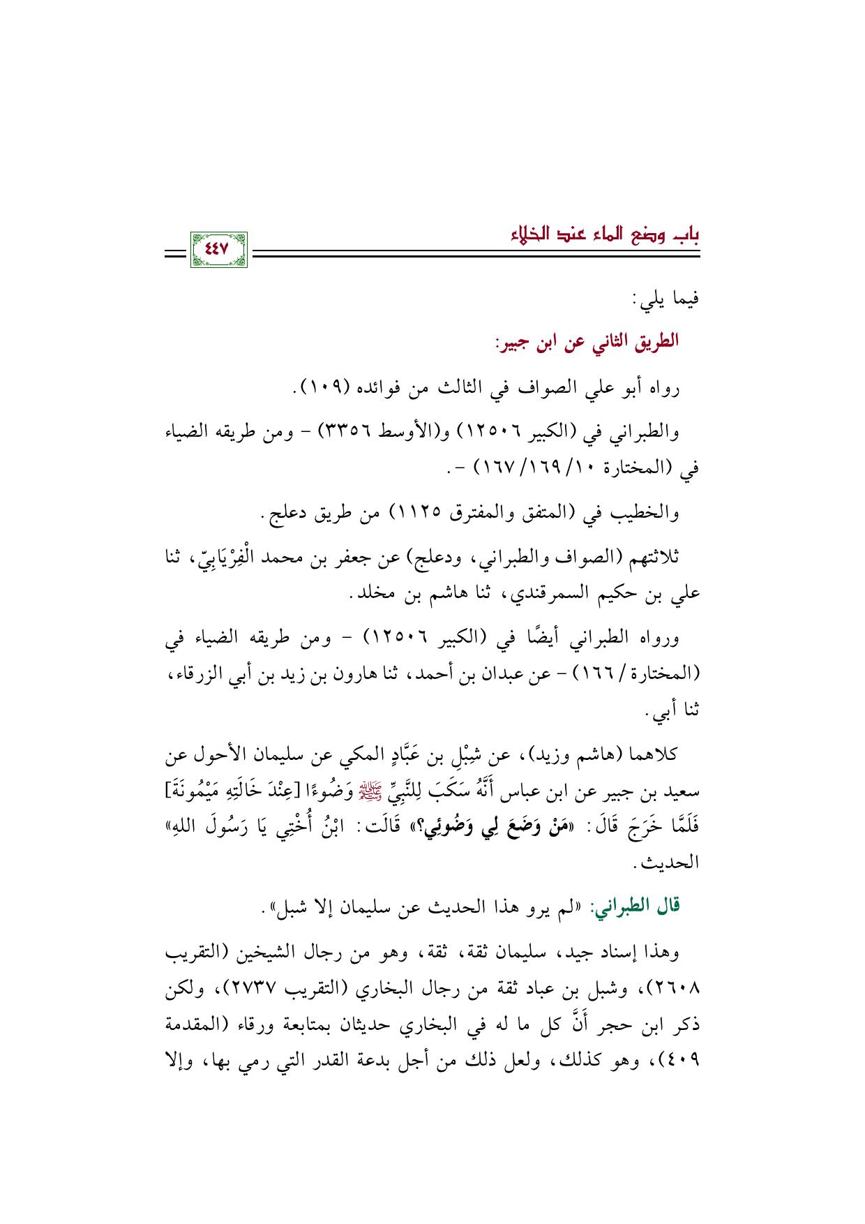كلاهما (هاشم وزيد)، عن شِبْلِ بن عَبَّادٍ المكي عن سليمان الأحول عن سعيد بن جبير عن ابن عباس أَنَّهُ سَكَبَ لِلنَّبِيِّ صَلَّى اللهُ عَلَيْهِ وَسَلَّمَ وَضُوءًا [عِنْدَ خَالَتِهِ مَيْمُونَةَ] فَلَمَّا خَرَجَ قَالَ: «مَنْ وَضَعَ لِي وَضُوئِي؟ » قَالَت: ابْنُ أُخْتِي يَا رَسُولَ اللهِ» الحديث.