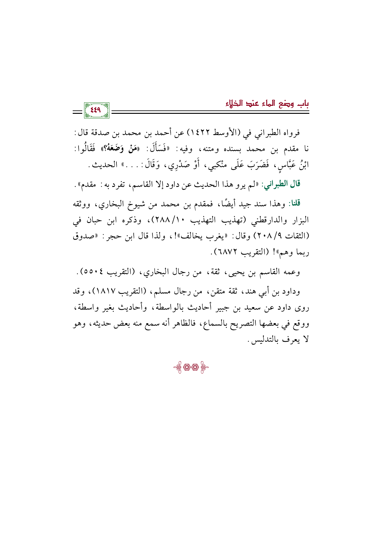 قال الطبراني: "لم يرو هذا الحديث عن داود إلا القاسم، تفرد به: مقدم".
