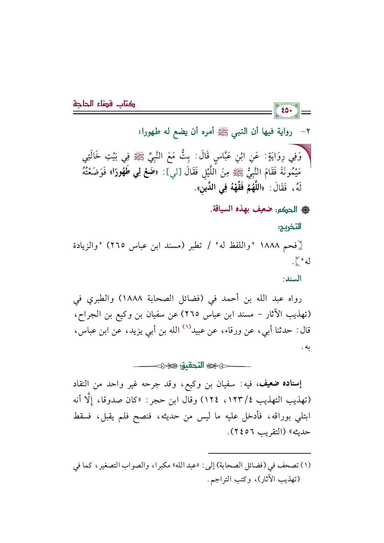 • وَفِي رِوَايَةٍ: عَنِ ابْنِ عَبَّاسٍ قَالَ: بِتُّ مَعَ النَّبِيِّ صَلَّى اللهُ عَلَيْهِ وَسَلَّمَ فِي بَيْتِ خَالَتِي مَيْمُونَةَ فَقَامَ النَّبِيُّ صَلَّى اللهُ عَلَيْهِ وَسَلَّمَ مِنَ اللَّيْلِ فَقَالَ [لي]: «ضَعْ لِي طَهُورًا» فَوَضَعْتُهُ لَهُ، فَقَالَ: «اللَّهُمَّ فَقِّهْهُ فِي الدِّينِ».