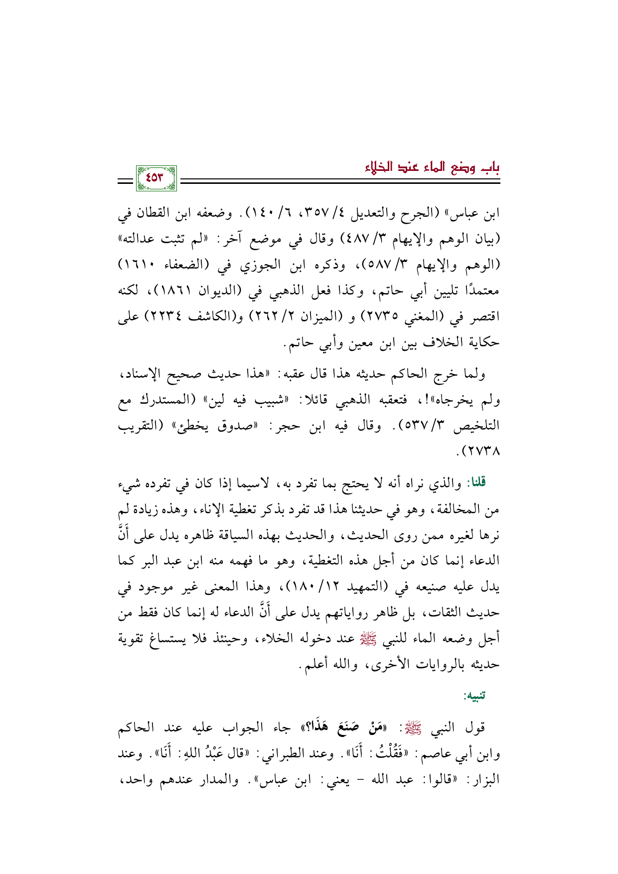 قلنا: والذي نراه أنه لا يحتج بما تفرد به، لاسيما إذا كان في تفرده شيء من المخالفة، وهو في حديثنا هذا قد تفرد بذكر تغطية الإناء، وهذه زيادة لم نرها لغيره ممن روى الحديث، والحديث بهذه السياقة ظاهره يدل على أَنَّ الدعاء إنما كان من أجل هذه التغطية، وهو ما فهمه منه ابن عبد البر كما يدل عليه صنيعه في (التمهيد ١٢/ ١٨٠)، وهذا المعنى غير موجود في حديث الثقات، بل ظاهر رواياتهم يدل على أَنَّ الدعاء له إنما كان فقط من أجل وضعه الماء للنبي صلى الله عليه وسلم عند دخوله الخلاء، وحينئذ فلا يستساغ تقوية حديثه بالروايات الأخرى، والله أعلم.