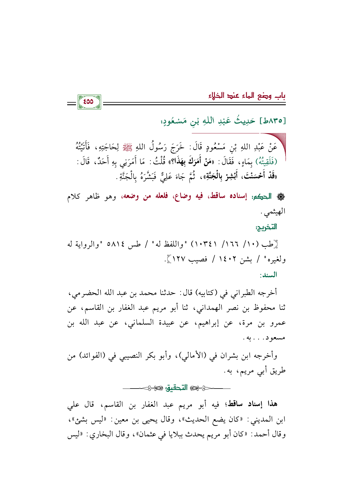 أخرجه الطبراني في (كتابيه) قال: حدثنا محمد بن عبد الله الحضرمي، ثنا محفوظ بن نصر الهمداني، ثنا أبو مريم عبد الغفار بن القاسم، عن عمرو بن مرة، عن إبراهيم، عن عبيدة السلماني، عن عبد الله بن مسعود ... به.