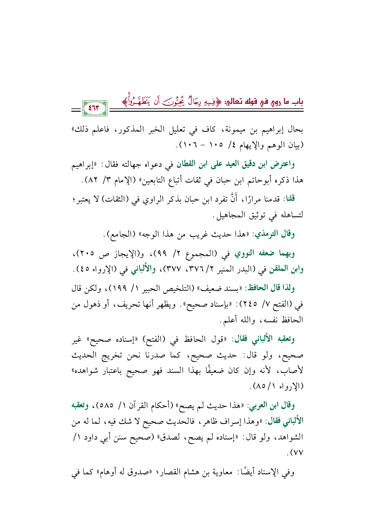 وقال ابن العربي: "هذا حديث لم يصح" (أحكام القرآن ١/ ٥٨٥)، وتعقبه الألباني فقال: "وهذا إسراف ظاهر، فالحديث صحيح لا شك فيه، لما له من الشواهد، ولو قال: "إسناده لم يصح، لصدق" (صحيح سنن أبي داود ١/ ٧٧).