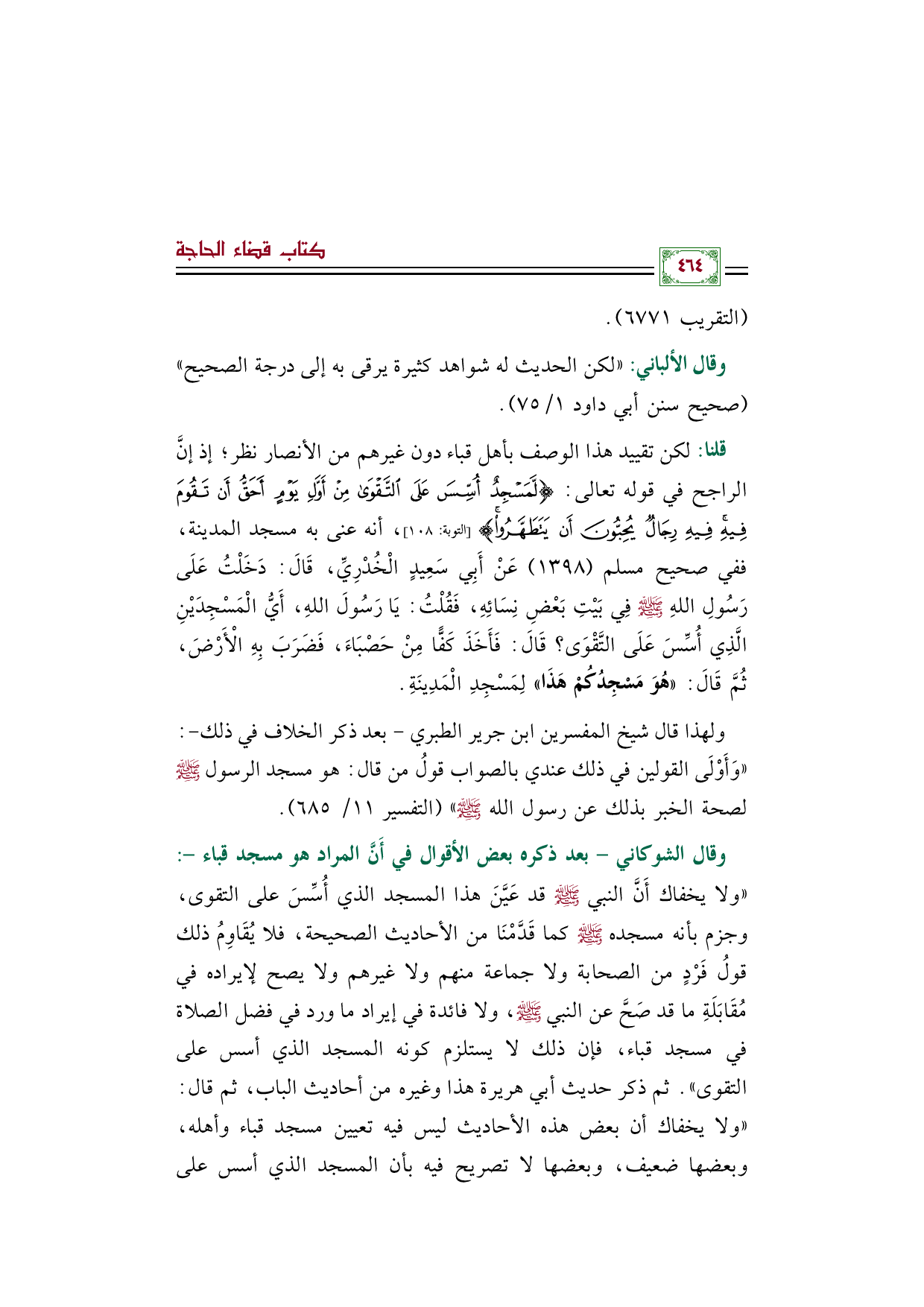 وقال الشوكاني - بعد ذكره بعض الأقوال في أَنَّ المراد هو مسجد قباء -: "ولا يخفاك أَنَّ النبي صلى الله عليه وسلم قد عَيَّنَ هذا المسجد الذي أُسِّسَ على التقوى، وجزم بأنه مسجده صلى الله عليه وسلم كما قَدَّمْنَا من الأحاديث الصحيحة، فلا يُقَاوِمُ ذلك قولُ فَرْدٍ من الصحابة ولا جماعة منهم ولا غيرهم ولا يصح لإيراده في مُقَابَلَةِ ما قد صَحَّ عن النبي صلى الله عليه وسلم، ولا فائدة في إيراد ما ورد في فضل الصلاة في مسجد قباء، فإن ذلك لا يستلزم كونه المسجد الذي أسس على التقوى". ثم ذكر حديث أبي هريرة هذا وغيره من أحاديث الباب، ثم قال: "ولا يخفاك أن بعض هذه الأحاديث ليس فيه تعيين مسجد قباء وأهله، وبعضها ضعيف، وبعضها لا تصريح فيه بأن المسجد الذي أسس على