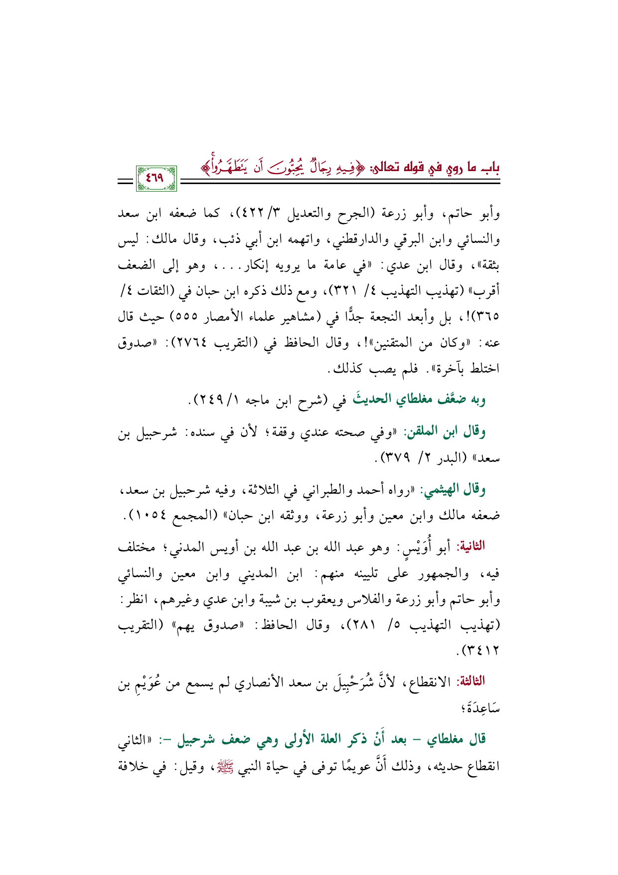 قال مغلطاي - بعد أَنْ ذكر العلة الأولى وهي ضعف شرحبيل -: "الثاني انقطاع حديثه، وذلك أَنَّ عويمًا توفى في حياة النبي صلى الله عليه وسلم، وقيل: في خلافة