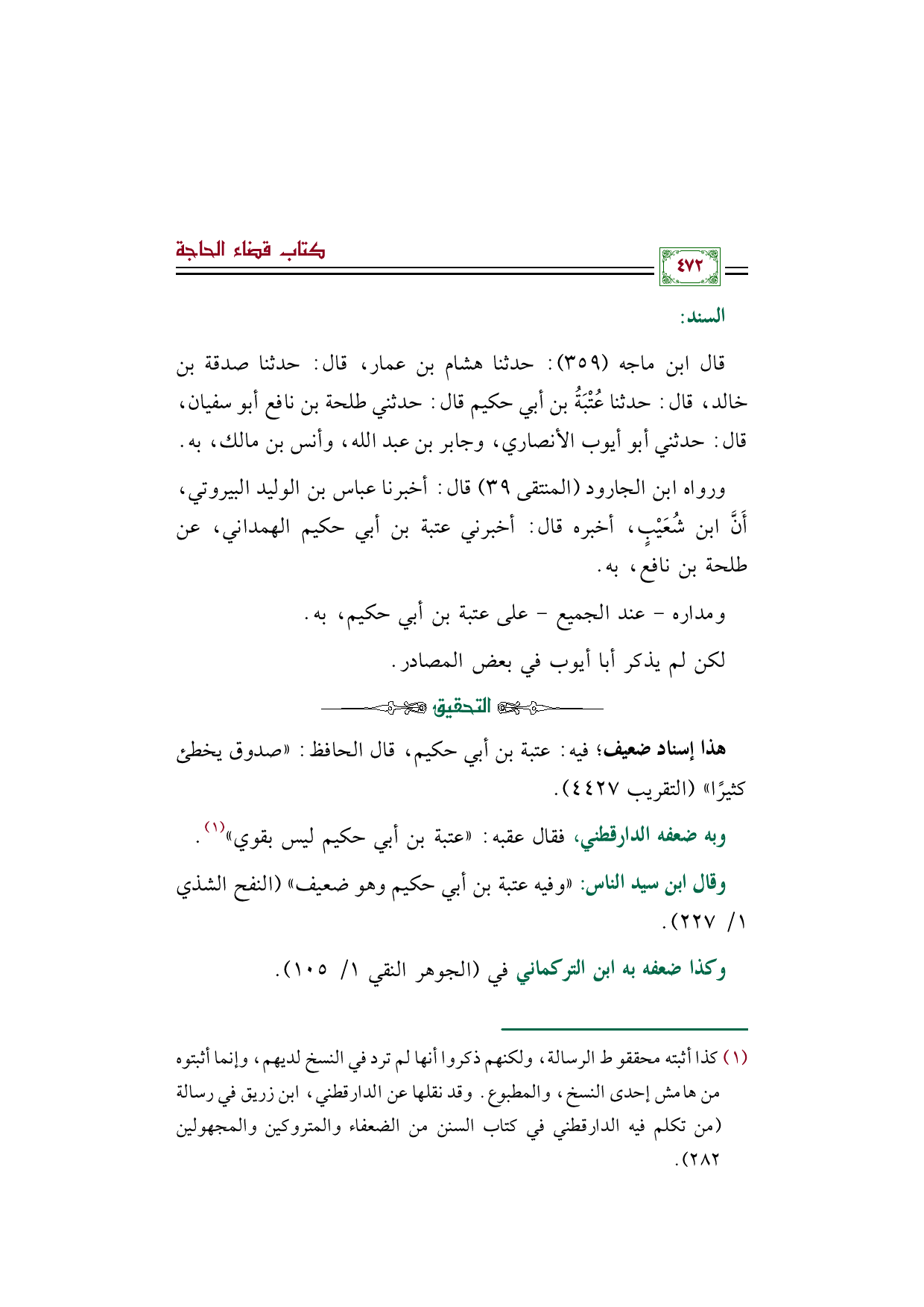 ورواه ابن الجارود (المنتقى ٣٩) قال: أخبرنا عباس بن الوليد البيروتي، أَنَّ ابن شُعَيْبٍ، أخبره قال: أخبرني عتبة بن أبي حكيم الهمداني، عن طلحة بن نافع، به.