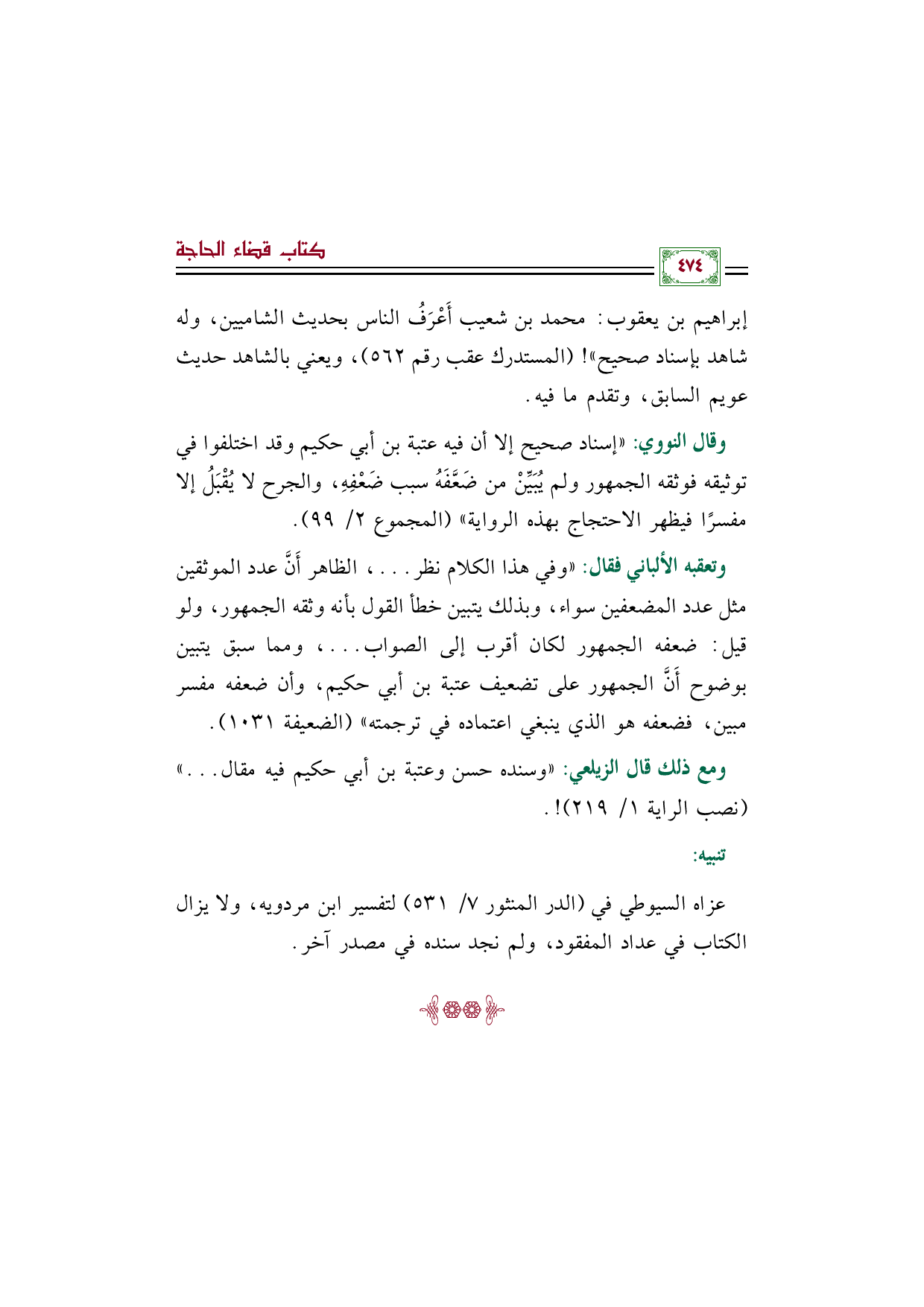 وتعقبه الألباني فقال: "وفي هذا الكلام نظر ... ، الظاهر أَنَّ عدد الموثقين مثل عدد المضعفين سواء، وبذلك يتبين خطأ القول بأنه وثقه الجمهور، ولو قيل: ضعفه الجمهور لكان أقرب إلى الصواب ... ، ومما سبق يتبين بوضوح أَنَّ الجمهور على تضعيف عتبة بن أبي حكيم، وأن ضعفه مفسر مبين، فضعفه هو الذي ينبغي اعتماده في ترجمته" (الضعيفة ١٠٣١).