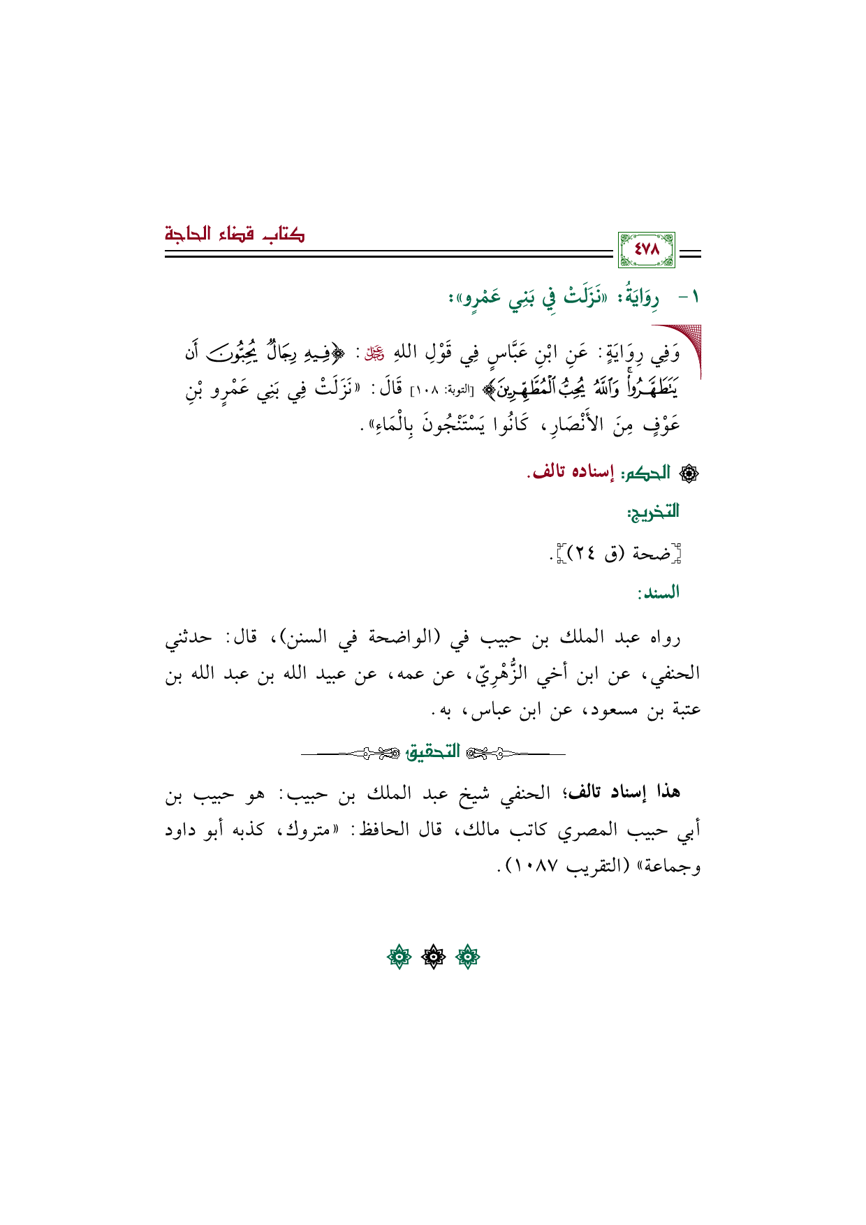 رواه عبد الملك بن حبيب في (الواضحة في السنن)، قال: حدثني الحنفي، عن ابن أخي الزُّهْرِيّ، عن عمه، عن عبيد الله بن عبد الله بن عتبة بن مسعود، عن ابن عباس، به.