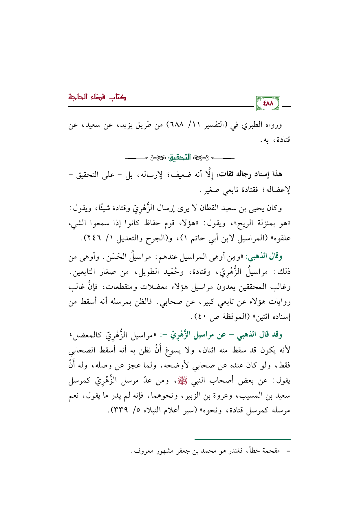 وكان يحيى بن سعيد القطان لا يرى إرسال الزُّهْرِيّ وقتادة شيئًا، ويقول: "هو بمنزلة الريح"، ويقول: "هؤلاء قوم حفاظ كانوا إذا سمعوا الشيء علقوه" (المراسيل لابن أبي حاتم ١)، و (الجرح والتعديل ١/ ٢٤٦).
