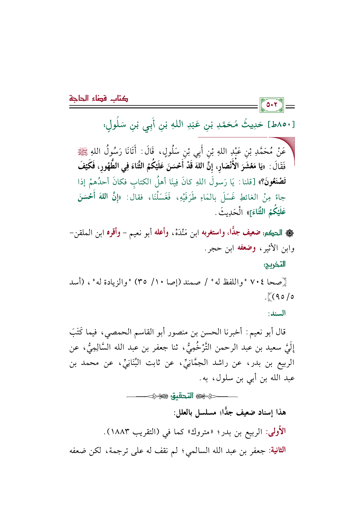 قال أبو نعيم: أخبرنا الحسن بن منصور أبو القاسم الحمصي، فيما كَتَبَ إِلَيَّ سعيد بن عبد الرحمن التَّرْخُمِيُّ، ثنا جعفر بن عبد الله السَّالِمِيُّ، عن الربيع بن بدر، عن راشد الحِمَّانِيِّ، عن ثابت البُنَانِيِّ، عن محمد بن عبد الله بن أبي بن سلول، به.