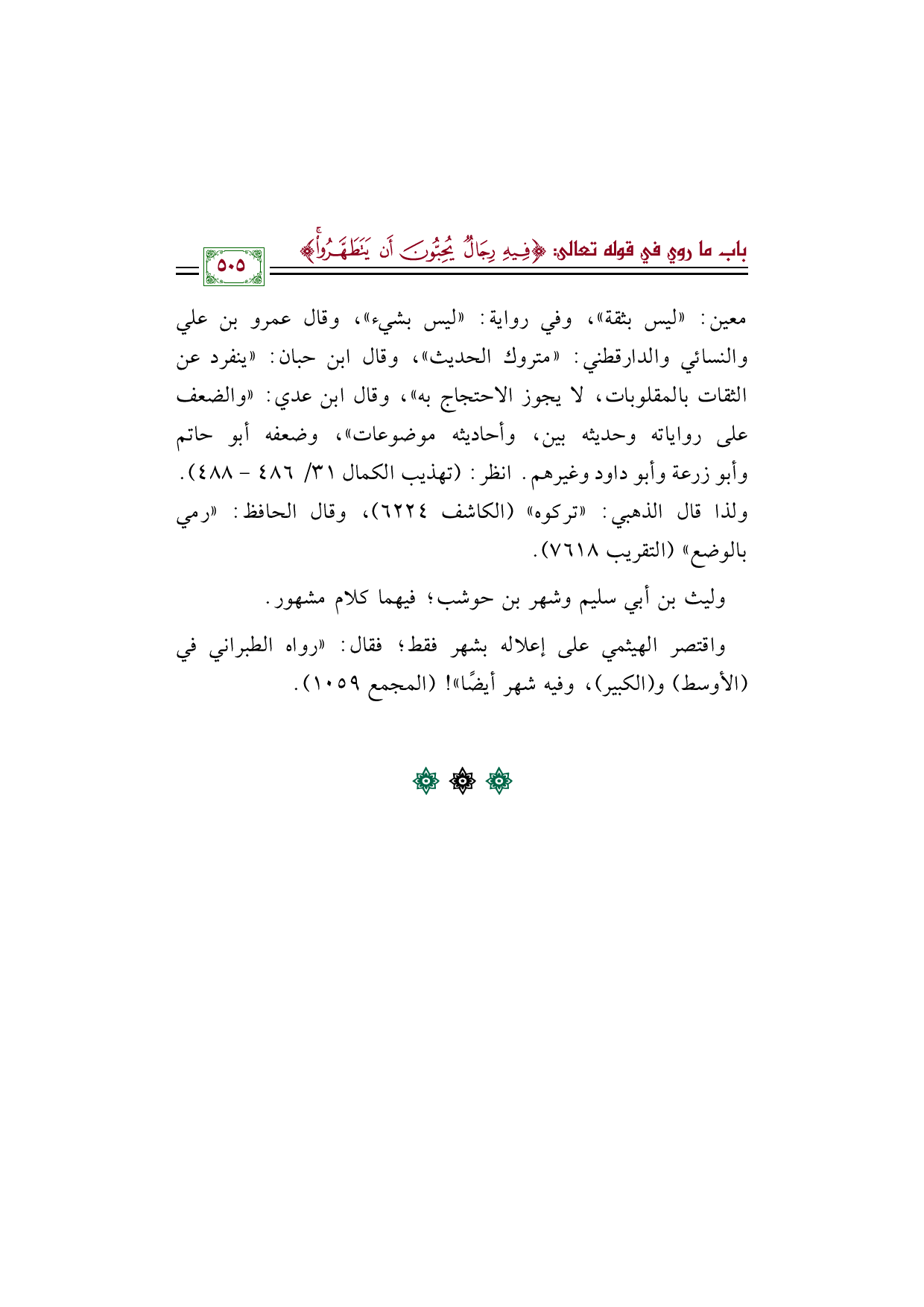 معين: "ليس بثقة"، وفي رواية: "ليس بشيء"، وقال عمرو بن علي والنسائي والدارقطني: "متروك الحديث"، وقال ابن حبان: "ينفرد عن الثقات بالمقلوبات، لا يجوز الاحتجاج به"، وقال ابن عدي: "والضعف على رواياته وحديثه بين، وأحاديثه موضوعات"، وضعفه أبو حاتم وأبو زرعة وأبو داود وغيرهم. انظر: (تهذيب الكمال ٣١/ ٤٨٦ - ٤٨٨). ولذا قال الذهبي: "تركوه" (الكاشف ٦٢٢٤)، وقال الحافظ: "رمي بالوضع" (التقريب ٧٦١٨).