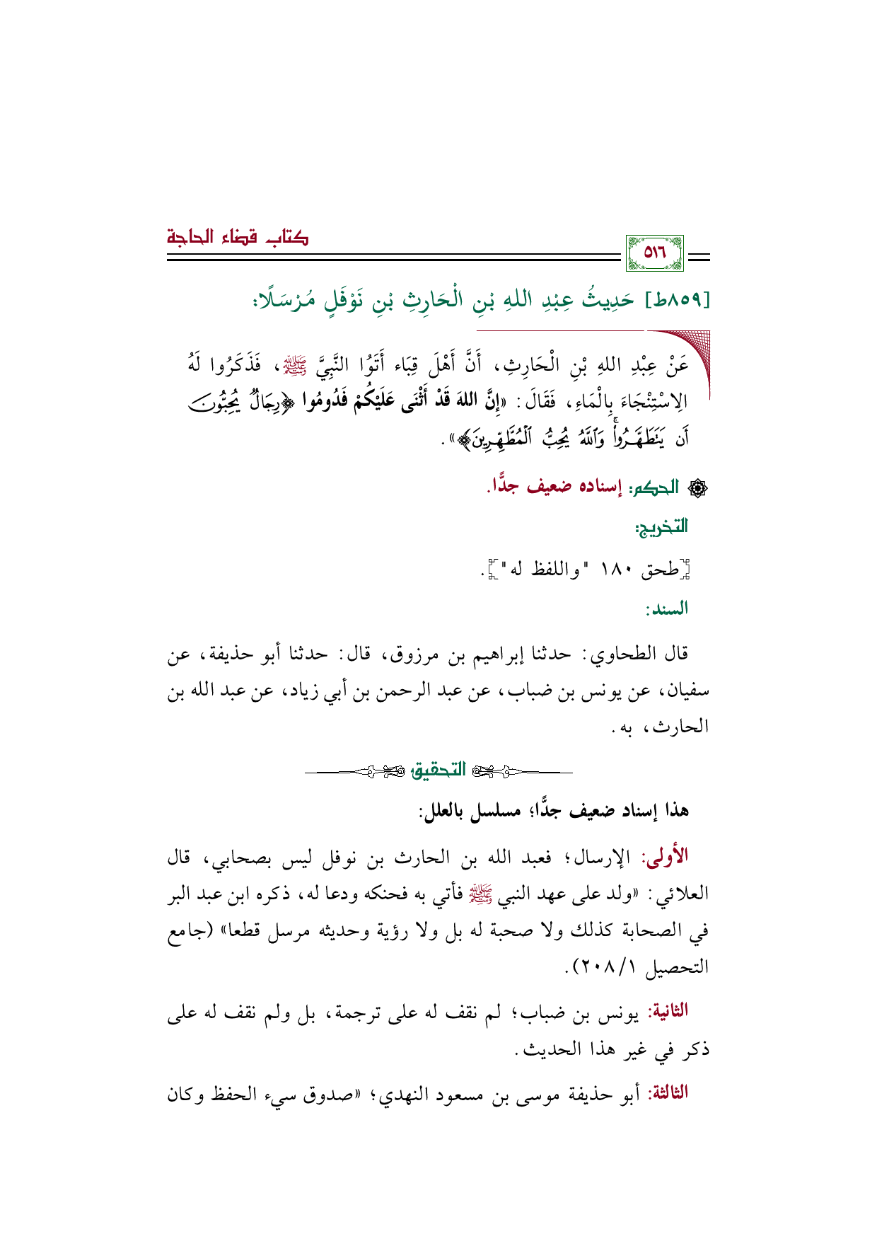 الأولى: الإرسال؛ فعبد الله بن الحارث بن نوفل ليس بصحابي، قال العلائي: "ولد على عهد النبي صلى الله عليه وسلم فأتي به فحنكه ودعا له، ذكره ابن عبد البر في الصحابة كذلك ولا صحبة له بل ولا رؤية وحديثه مرسل قطعا" (جامع التحصيل ١/ ٢٠٨).