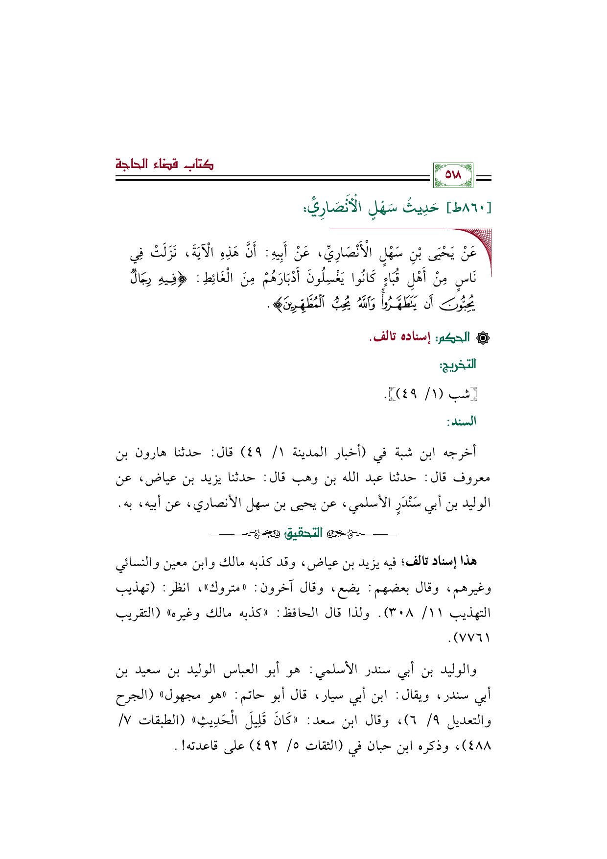 أخرجه ابن شبة في (أخبار المدينة ١/ ٤٩) قال: حدثنا هارون بن معروف قال: حدثنا عبد الله بن وهب قال: حدثنا يزيد بن عياض، عن الوليد بن أبي سَنْدَرٍ الأسلمي، عن يحيى بن سهل الأنصاري، عن أبيه، به.