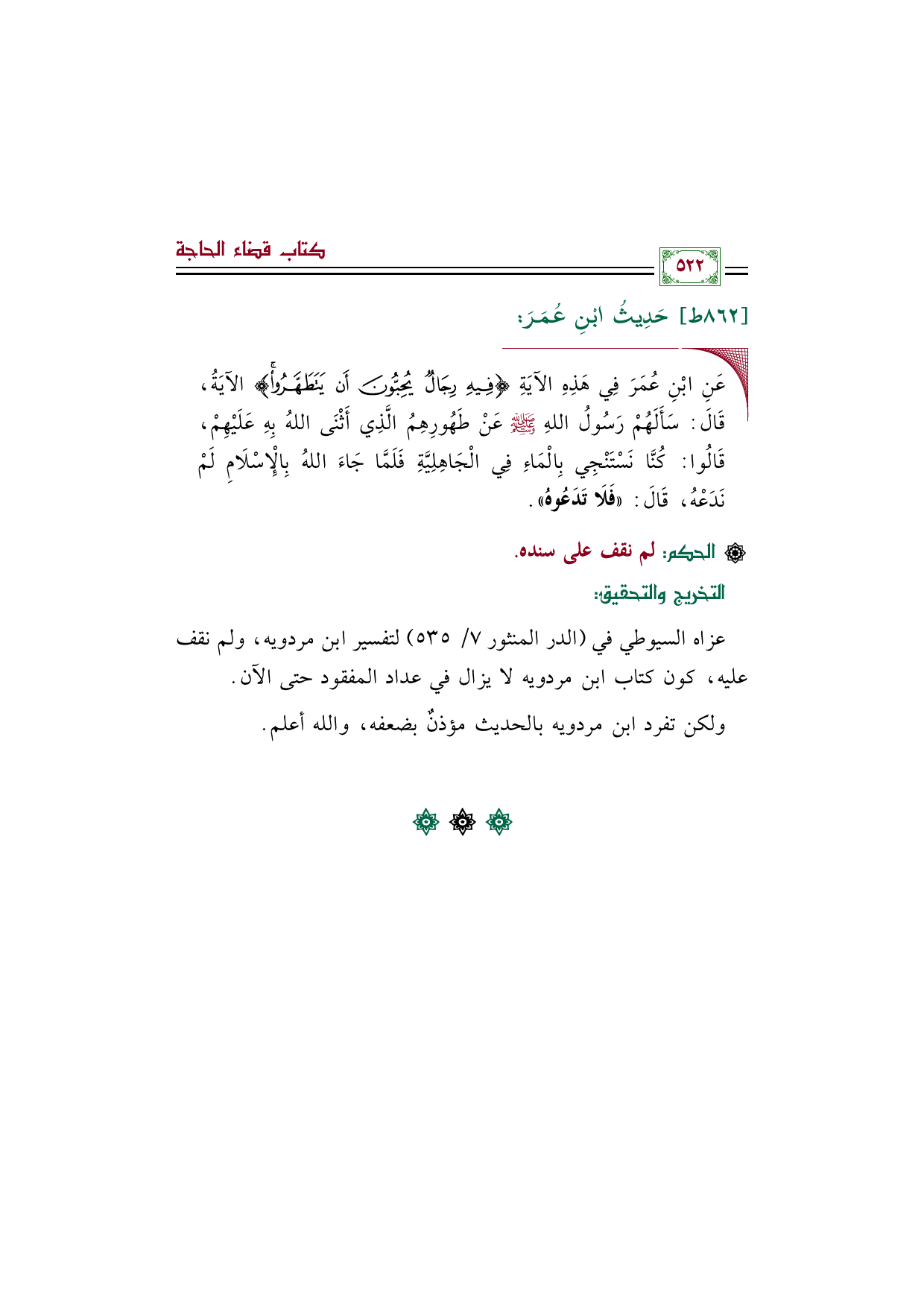 ◼ عَنِ ابْنِ عُمَرَ فِي هَذِهِ الآيَةِ {فيه رجال يحبون أَنْ يتطهروا} الآيَةُ، قَالَ: سَأَلَهُمْ رَسُولُ اللهِ صلى الله عليه وسلم عَنْ طَهُورِهِمُ الَّذِي أَثْنَى اللهُ بِهِ عَلَيْهِمْ، قَالُوا: كُنَّا نَسْتَنْجِي بِالْمَاءِ فِي الْجَاهِلِيَّةِ فَلَمَّا جَاءَ اللهُ بِالْإِسْلَامِ لَمْ نَدَعْهُ، قَالَ: «فَلَا تَدَعُوهُ».
