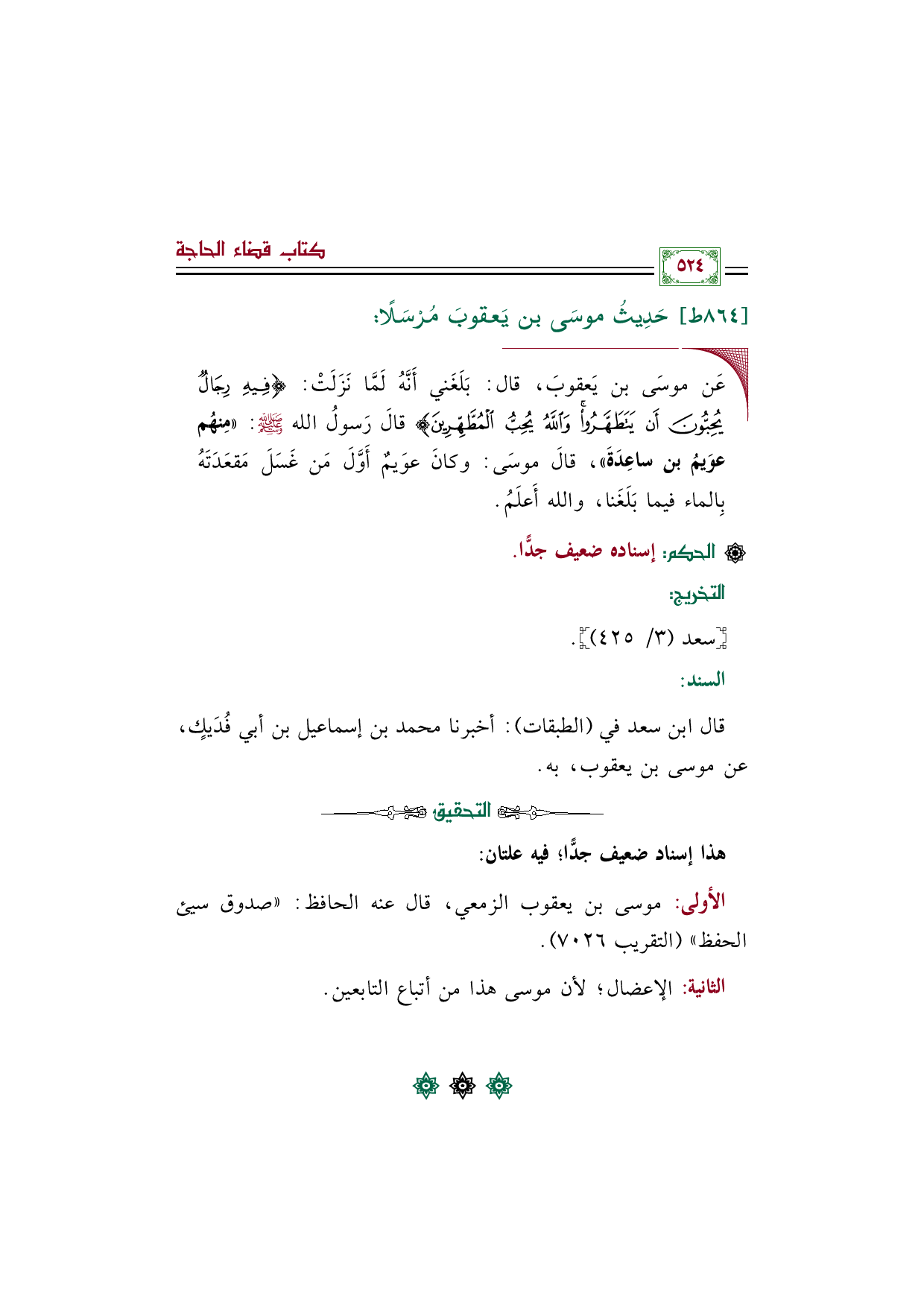 ◼ عَن موسَى بن يَعقوبَ، قال: بَلَغَني أَنَّهُ لَمَّا نَزَلَتْ: {فيه رِجالٌ يُحِبّونَ أَن يَتَطَهَّروا والله يُحِبُّ المُطَّهِّرينَ} قالَ رَسولُ الله صَلى الله عَليه وسَلم: «مِنهُم عوَيمُ بن ساعِدَةَ»، قالَ موسَى: وكانَ عوَيمٌ أَوَّلَ مَن غَسَلَ مَقعَدَتَهُ بِالماء فيما بَلَغَنا، والله أَعلَمُ.