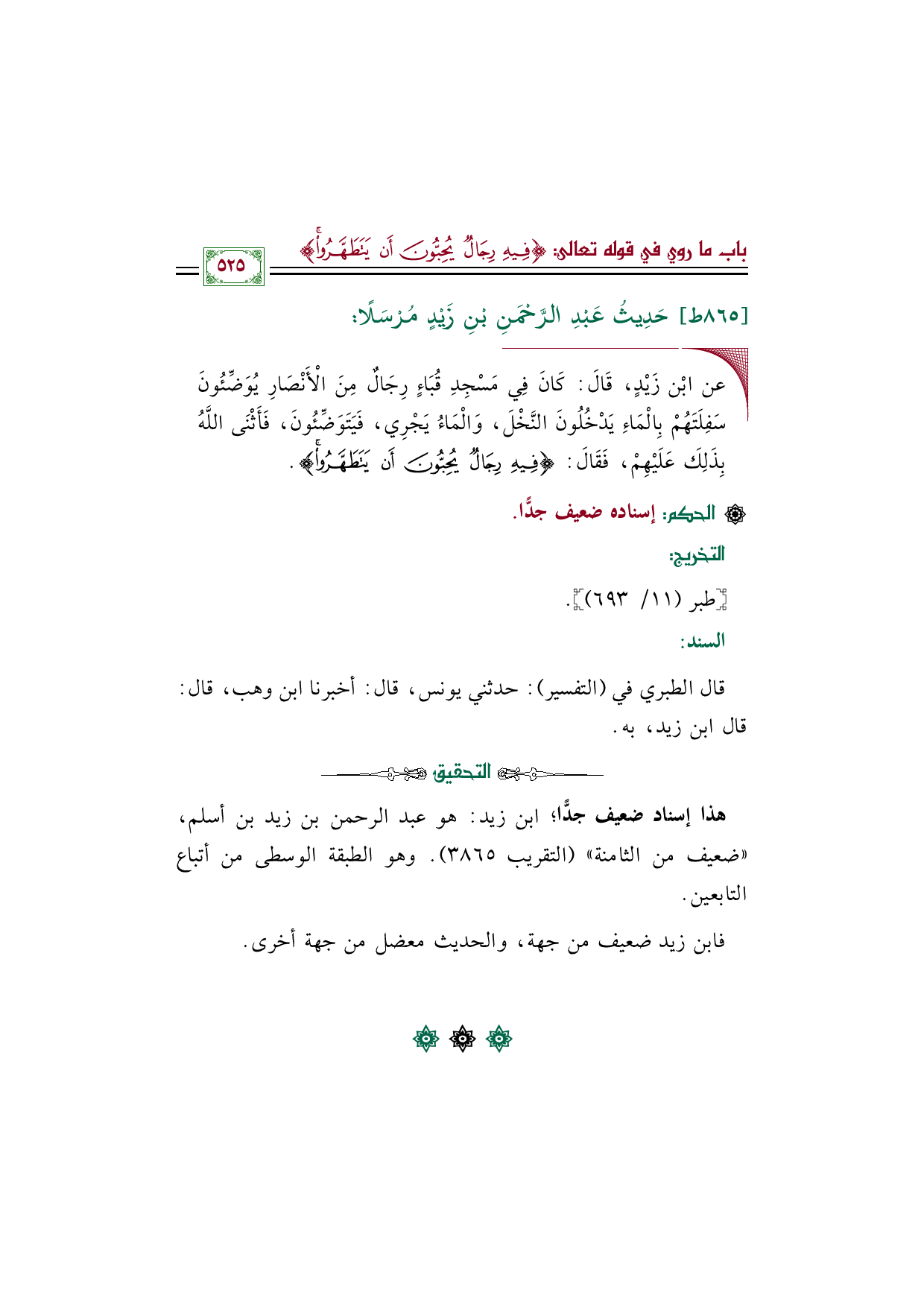هذا إسناد ضعيف جدًّا؛ ابن زيد: هو عبد الرحمن بن زيد بن أسلم، "ضعيف من الثامنة" (التقريب ٣٨٦٥). وهو الطبقة الوسطى من أتباع التابعين.